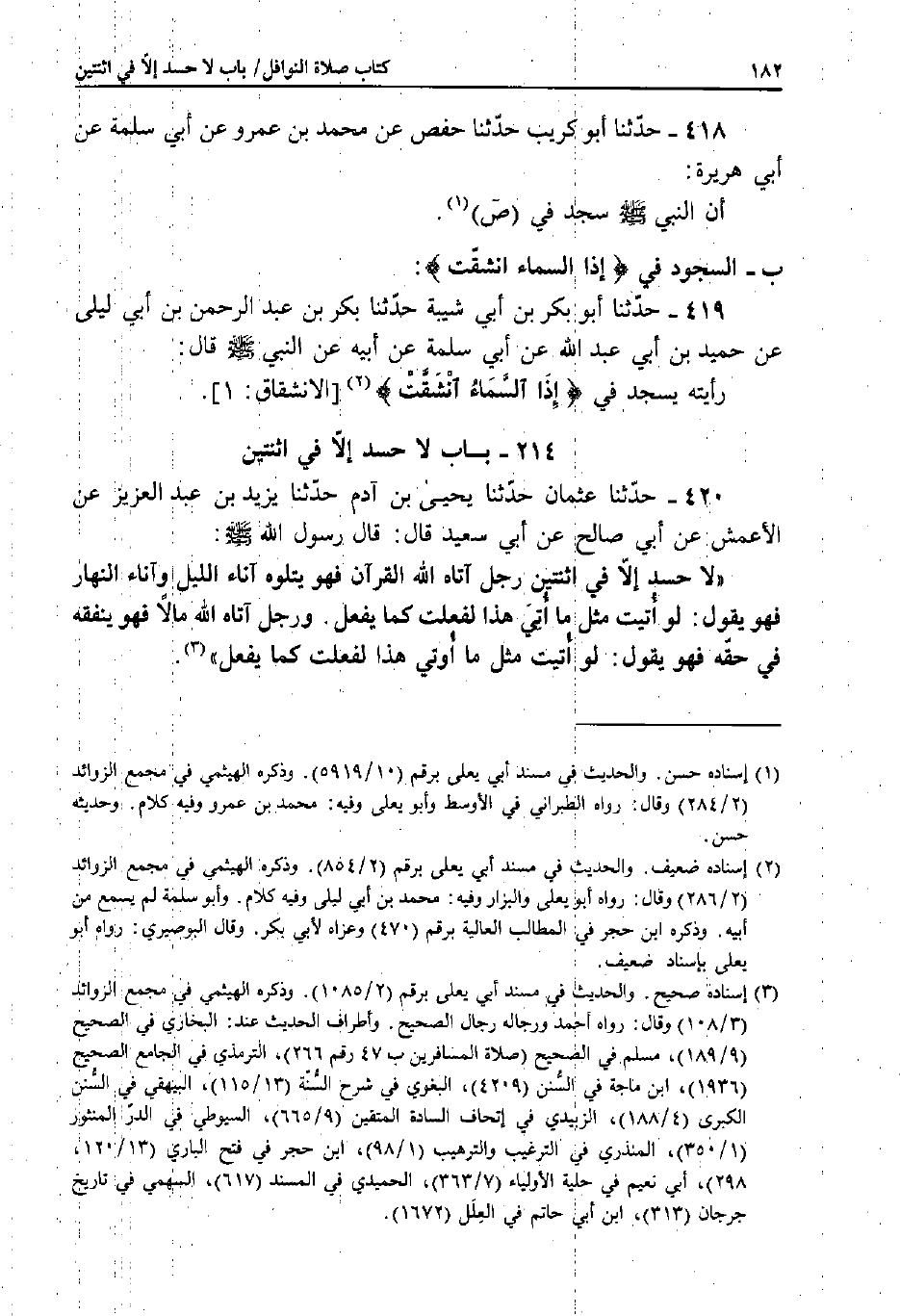 420 - حَدَّثَنَا عُثْمَانُ، حَدَّثَنَا يَحْيَى بْنُ آدَمَ، حَدَّثَنَا يَزِيدُ بْنُ عَبْدِ الْعَزِيزِ، عَنِ الأَعْمَشِ، عَنْ أَبِي صَالِحٍ، عَنْ أَبِي سَعِيدٍ قَالَ: قَالَ رَسُولُ اللَّهِ صَلَّى اللَّهُ عَلَيْهِ وَسَلَّمَ: " لا حَسَدَ إِلا فِي اثْنَتَيْنِ: رَجُلٍ آتَاهُ اللَّهُ الْقُرْآنَ فَهُوَ يَتْلُوهُ آنَاءَ اللَّيْلِ وَآنَاءَ النَّهَارِ فَهُوَ يَقُولُ: لَوْ أُوتِيتُ مِثْلَ مَا أُوتِيَ هَذَا لَفَعَلْتُ كَمَا يَفْعَلُ.