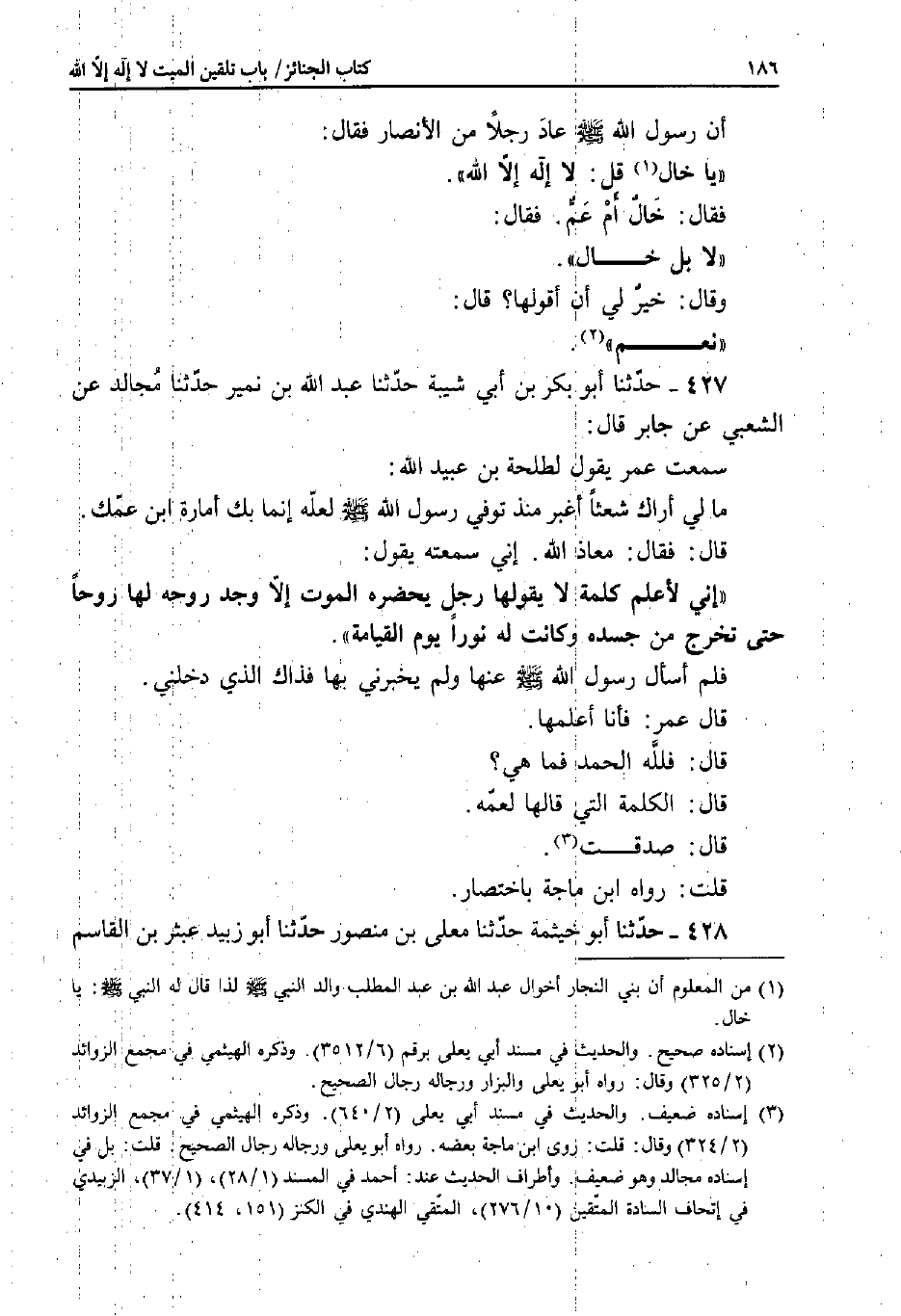 أَنَّ رَسُولَ اللَّهِ صَلَّى اللَّهُ عَلَيْهِ وَسَلَّمَ عَادَ رَجُلا مِنَ الأَنْصَارِ فَقَالَ: " يَا خَالِ قُلْ: لا إِلَهَ إِلا اللَّهُ ".