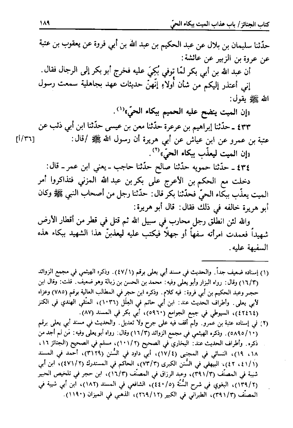 434 - حَدَّثَنَا حَمُّوَيْهِ، حَدَّثَنَا صَالِحٌ، حَدَّثَنَا حَاجِبٌ - يَعْنِي ابْنَ عُمَرَ، قَالَ: دَخَلْتُ مَعَ الْحَكَمِ بْنِ الأَعْرَجِ عَلَى بَكْرِ بْنِ عَبْدِ اللَّهِ الْمُزَنِيِّ فَتَذَاكَرُوا أَمْرَ الْمَيِّتِ يُعَذَّبُ بِبُكَاءِ الْحَيِّ فَحَدَّثَنَا بَكْرٌ قَالَ: حَدَّثَنَا رَجُلٌ مِنْ أَصْحَابِ النَّبِيِّ صَلَّى اللَّهُ عَلَيْهِ وَسَلَّمَ وَكَانَ أَبُو هُرَيْرَةَ خَالَفَهُ فِي ذَلِكَ فَقَالَ: قَالَ أَبُو هُرَيْرَةَ: وَاللَّهِ لَئِنِ انْطَلَقَ رَجُلٌ مُحَارِبٌ فِي سَبِيلِ اللَّهِ ثُمَّ قُتِلَ فِي قُطْرٍ مِنْ أَقْطَارِ الأَرْضِ شَهِيدًا فَعَمِدَتْهُ امْرَأَتُهُ سَفَهًا أَوْ جَهْلا فَبَكَتْ عَلَيْهِ لَيُعَذَّبَنَّ هَذَا الشَّهِيدُ بِبُكَاءِ هَذِهِ السَّفِيهَةِ عَلَيْهِ.