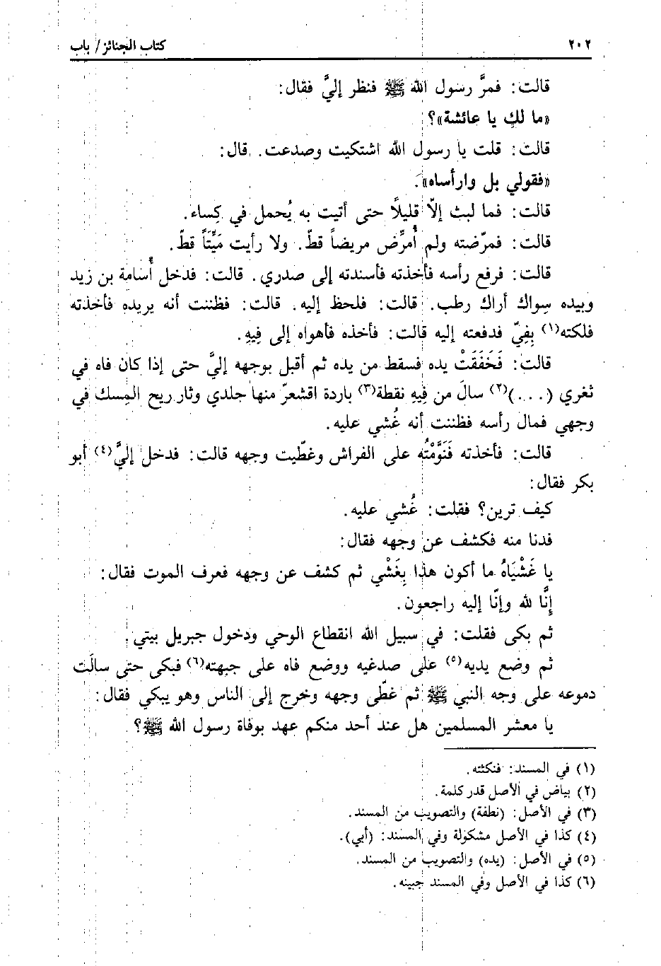 قَالَتْ: فَمَرَّ رَسُولُ اللَّهِ صَلَّى اللَّهُ عَلَيْهِ وَسَلَّمَ فَنَظَرَ إِلَيَّ فَقَالَ: «مَا لَكِ يَا عَائِشَةُ» ؟ قَالَتْ: قُلْتُ: يَا رَسُولَ اللَّهِ، اشْتَكَيْتُ وَصَدَعْتُ.