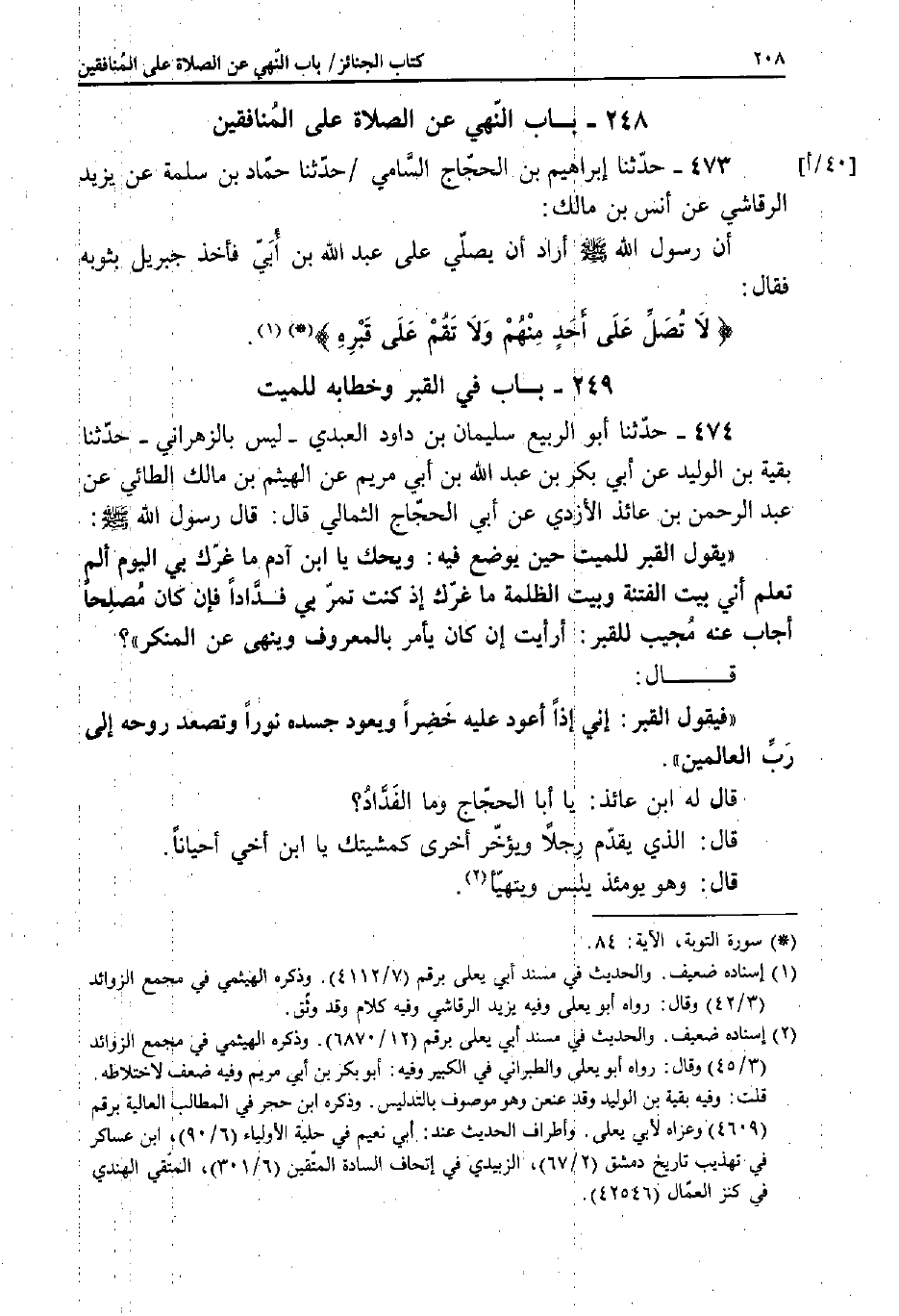 473 - حَدَّثَنَا إِبْرَاهِيمُ بْنُ الْحَجَّاجِ السَّامِيُّ، حَدَّثَنَا حَمَّادُ بْنُ سَلَمَةَ، عَنْ يَزِيدَ الرَّقَاشِيُّ، عَنْ أَنَسِ بْنِ مَالِك: أَنَّ رَسُولَ اللَّهِ صَلَّى اللَّهُ عَلَيْهِ وَسَلَّمَ أَرَادَ أَنْ يُصَلِّيَ عَلَى عَبْدِ اللَّهِ بْنِ أُبَيٍّ فَأَخَذَ جِبْرِيلُ بُثَوْبِهِ، فَقَالَ: {وَلا تُصَلِّ عَلَى أَحَدٍ مِنْهُمْ مَاتَ أَبَدًا وَلا تَقُمْ عَلَى قَبْرِهِ} [التوبة: 84] .