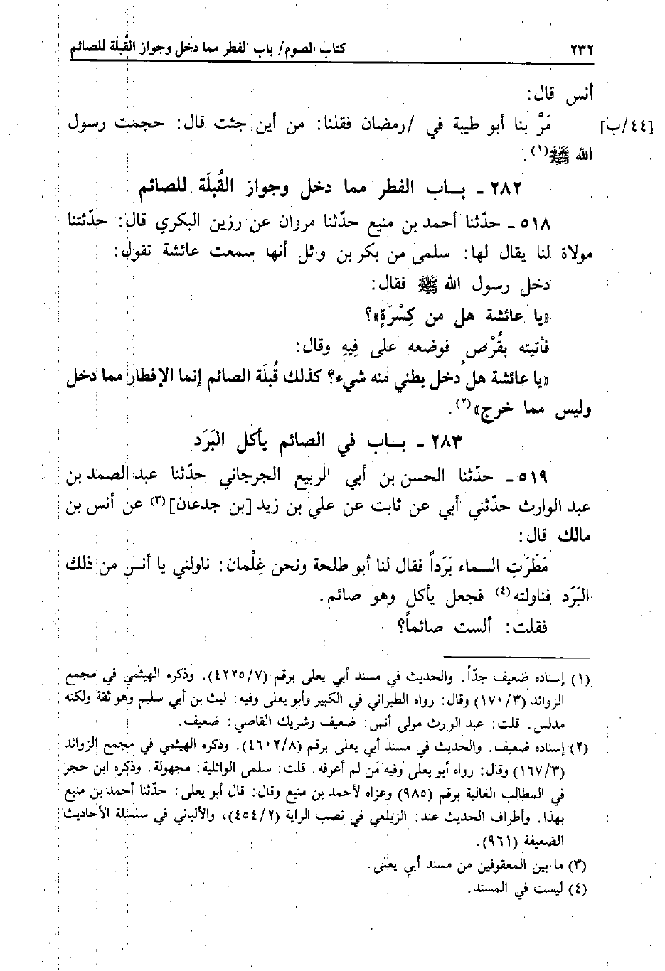 518 - حَدَّثَنَا أَحْمَدُ بْنُ مَنِيعٍ، حَدَّثَنَا مَرْوَانُ، عَنْ رَزِينٍ الْبَكْرِيِّ قَالَ: حَدَّثَتْنَا مَوْلاةٌ لَنَا يُقَالُ لَهَا: سَلْمَى مِنْ بَكْرِ بْنِ وَائِلٍ أَنَّهَا سَمِعَتْ عَائِشَةَ تَقُولُ: دَخَلَ رَسُولُ اللَّهِ صَلَّى اللَّهُ عَلَيْهِ وَسَلَّمَ فَقَالَ: «يَا عَائِشَةُ هَلْ مِنْ كِسْرَةٍ» ؟ فَأَتَتْهُ بِقُرْصٍ فَوَضَعَهُ عَلَى فِيهِ وَقَالَ: «يَا عَائِشَةُ هَلْ دَخَلَ بَطْنِي مِنْهُ شَيْءٌ؟ كَذَلِكَ قُبْلَةُ الصَّائِمِ إِنَّمَا الإِفْطَارُ مِمَّا دَخَلَ وَلَيْسَ مِمَّا خَرَجَ» .