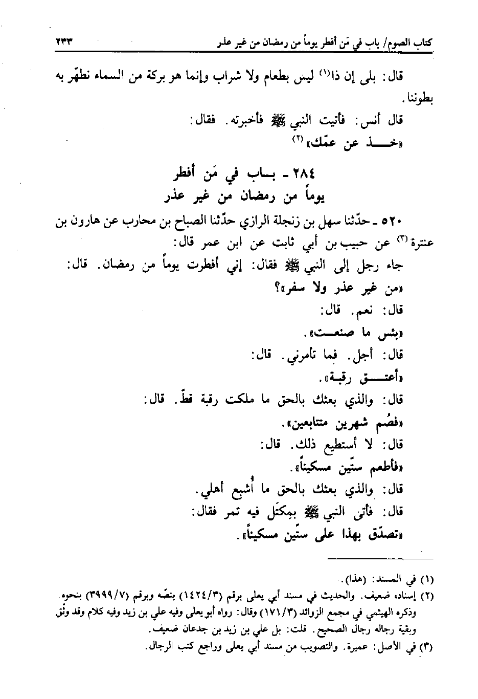 520 - حَدَّثَنَا سَهْلُ بْنُ زَنْجَلَةَ الرَّازِيُّ، حَدَّثَنَا الصَّبَّاحُ بْنُ مُحَارِبٍ، عَنْ هَارُونَ بْنِ عَنْتَرَةَ، عَنْ حَبِيبِ بْنِ أَبِي ثَابِتٍ، عَنِ ابْنِ عُمَرَ قَالَ: جَاءَ رَجُلٌ إِلَى النَّبِيِّ صَلَّى اللَّهُ عَلَيْهِ وَسَلَّمَ فَقَالَ: إِنِّي أَفْطَرْتُ يَوْمًا مِنْ رَمَضَانَ.
