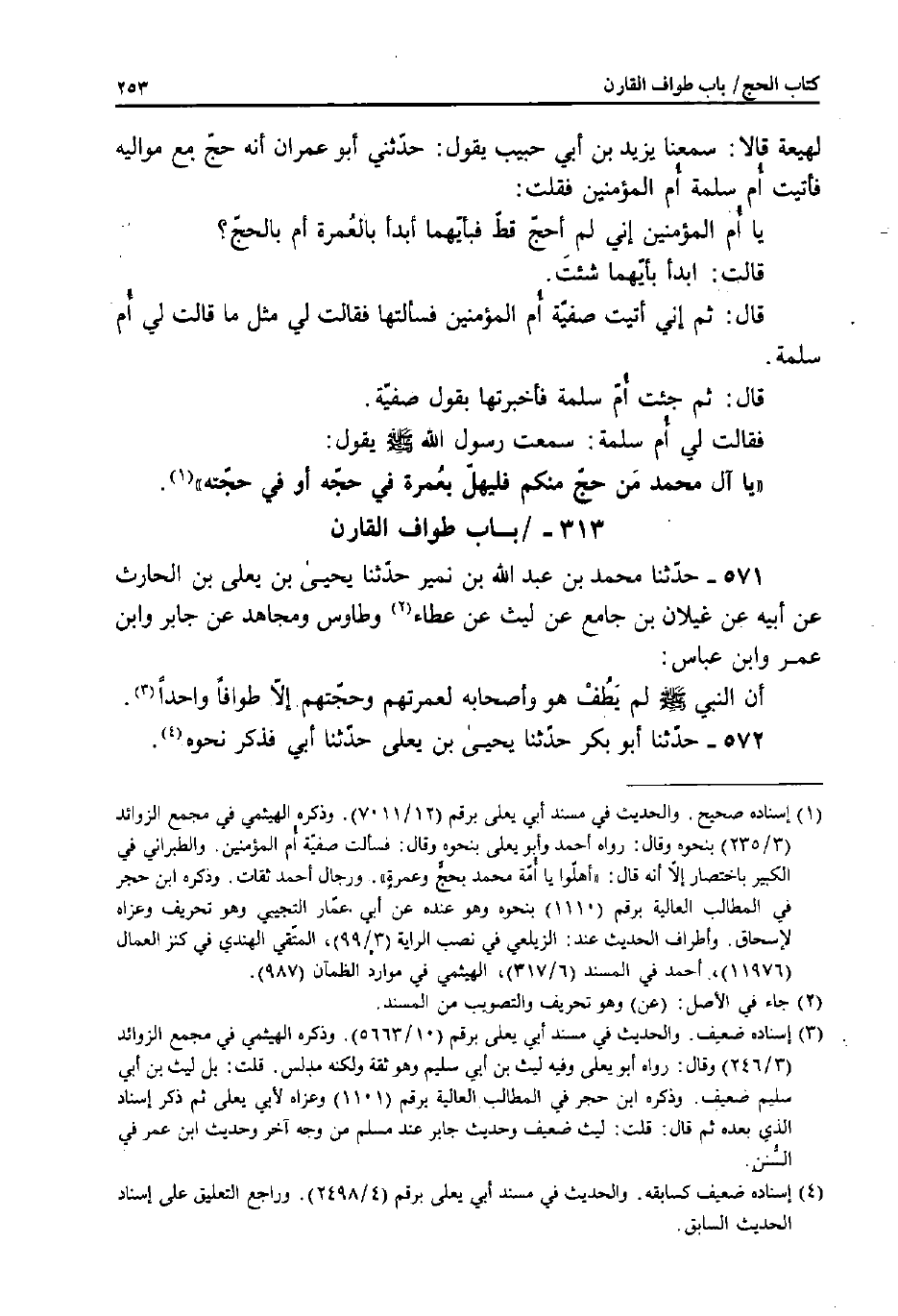 571 - حَدَّثَنَا مُحَمَّدُ بْنُ عَبْدِ اللَّهِ بْنِ نُمَيْرٍ، حَدَّثَنَا يَحْيَى بْنُ يَعْلَى بْنِ الْحَارِثِ، عَنْ أَبِيهِ، عَنْ غَيْلانَ بْنِ جَامِعٍ، عَنْ لَيْثٍ، عَنْ عَطَاءٍ، وَطَاوُسٍ، وَمُجَاهِدٍ، عَنْ جَابِرٍ، وَابْنِ عُمَرَ، وَابْنِ عَبَّاسٍ: أَنَّ النَّبِيَّ صَلَّى اللَّهُ عَلَيْهِ وَسَلَّمَ لَمْ يَطُفْ هُوَ وَأَصْحَابُهُ لِعُمْرَتِهِمْ وَحَجَّتِهِمْ إِلا طَوَافًا وَاحِدًا.