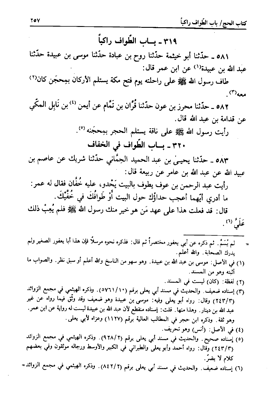 583 - حَدَّثَنَا يَحْيَى بْنُ عَبْدِ الْحَمِيدِ الْحِمَّانِيُّ، حَدَّثَنَا شَرِيكٌ، عَنْ عَاصِمِ بْنِ عُبَيْدِ اللَّهِ، عَنْ عَبْدِ اللَّهِ بْنِ عَامِرٍ، عَنْ رَبِيعَةَ قَالَ: رَأَيْتُ عَبْدَ الرَّحْمَنِ بْنَ عَوْفٍ يَطُوفُ بِالْبَيْتِ يَحْدُو، عَلَيْهِ خُفَّانِ فَقَالَ لَهُ عُمَرُ: مَا أَدْرِي أَيُّهُمَا أَعْجَبُ حُدَاؤُكَ حَوْلَ الْبَيْتِ أَوْ طَوَافُكَ فِي خُفَّيْكَ.