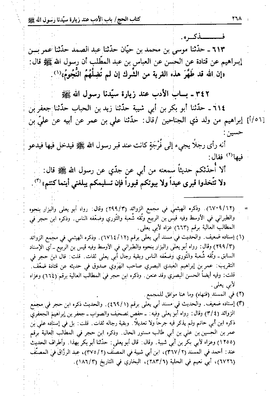 614 - حَدَّثَنَا أَبُو بَكْرِ بْنُ أَبِي شَيْبَةَ، حَدَّثَنَا زَيْدُ بْنُ الْحُبَابِ، حَدَّثَنَا جَعْفَرُ بْنُ إِبْرَاهِيمَ مِنْ وَلَدِ ذِي الْجَنَاحَيْنِ قَالَ: حَدَّثَنَا عَلِيُّ بْنُ عُمَرَ، عَنْ أَبِيهِ، عَنْ عَلِيِّ بْنِ حُسَيْنٍ: أَنَّهُ رَأَى رَجُلا يَجِيءُ إِلَى فُرْجَةٍ كَانَتْ عِنْدَ قَبْرِ رَسُولِ اللَّهِ صَلَّى اللَّهُ عَلَيْهِ وَسَلَّمَ فَيَدْخُلُ فِيهَا فَيَدْعُو فِيهَا فَقَالَ: أَلا أُحَدِّثُكُمْ حَدِيثًا سَمِعْتُهُ مِنْ أَبِي، عَنْ جَدِّي، عَنْ رَسُولِ اللَّهِ صَلَّى اللَّهُ عَلَيْهِ وَسَلَّمَ قَالَ: «لا تَتَّخِذُوا قَبْرِي عِيدًا، وَلا بُيُوتَكُمْ قُبُورًا، فَإِنَّ تَسْلِيمَكُمْ يَبْلُغُنِي أَيْنَمَا كُنْتُمْ» .