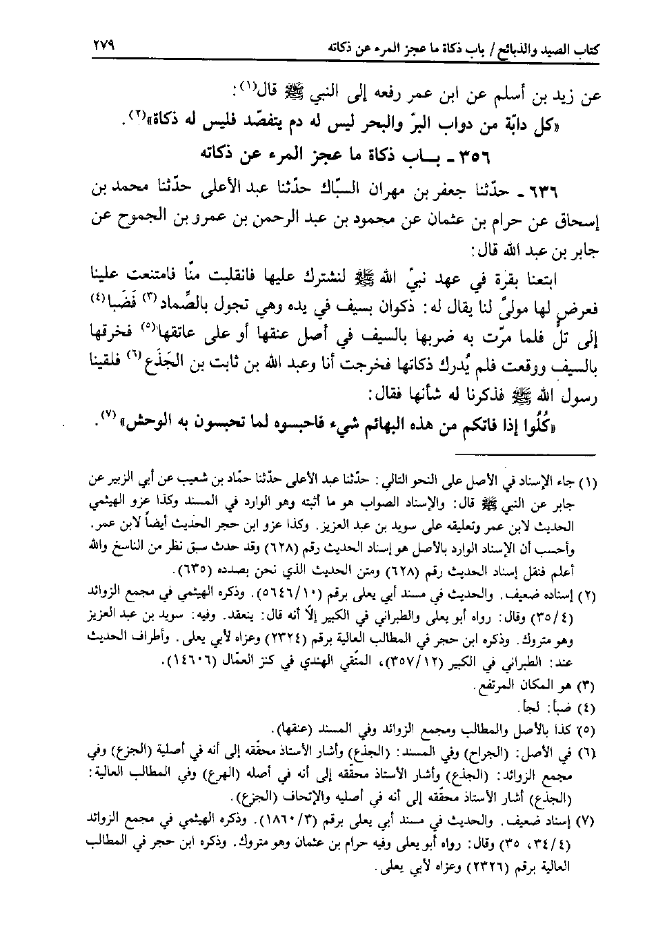 عَنْ زَيْدِ بْنِ أَسْلَمَ، عَنِ ابْنِ عُمَرَ رَفَعَهُ إِلَى النَّبِيِّ صَلَّى اللَّهُ عَلَيْهِ وَسَلَّمَ قَالَ: «كُلُّ دَابَّةٍ مِنْ دَوَابِّ الْبَرِّ وَالْبَحْرِ لَيْسَ لَهُ دَمٌ يَتَفَصَّدُ فَلَيْسَ لَهُ ذَكَاةٌ» .