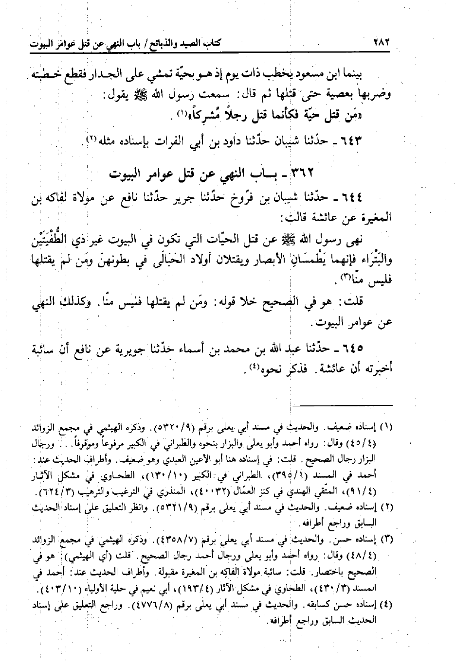 644 - حَدَّثَنَا شَيْبَانُ بْنُ فَرُّوخَ، حَدَّثَنَا جَرِيرٌ، حَدَّثَنَا نَافِعٌ، عَنْ مَوْلاةٍ لِفَاكِهِ بْنِ الْمُغِيرَةِ، عَنْ عَائِشَةَ قَالَتْ: نَهَى رَسُولُ اللَّهِ صَلَّى اللَّهُ عَلَيْهِ وَسَلَّمَ عَنْ قَتْلِ الْحَيَّاتِ الَّتِي تَكُونُ فِي الْبُيُوتِ غَيْرَ ذِي الطُّفْيَتَيْنِ وَالْبَتْرَاءِ، فَإِنَّهُمَا يَطْمِسَانِ الأَبْصَارَ وَيَقْتُلانِ أَوْلادَ الْحَبَالَى فِي بُطُونِهِنَّ وَمَنْ لَمْ يَقْتُلْهَا فَلَيْسَ مِنَّا.