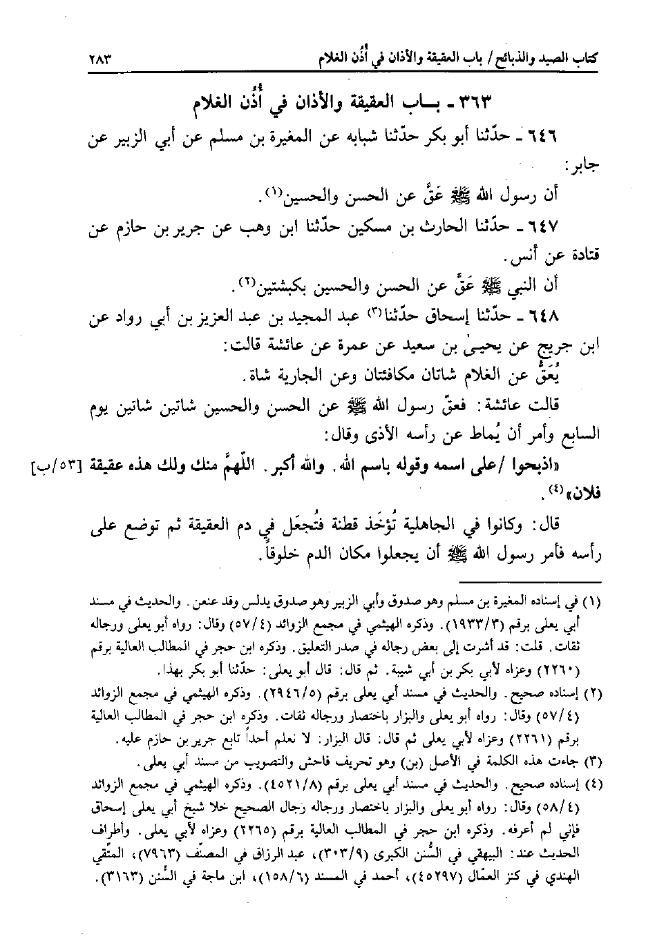 646 - حَدَّثَنَا أَبُو بَكْرٍ، حَدَّثَنَا شَبَابَةُ، عَنِ الْمُغِيرَةِ بْنِ مُسْلِمٍ، عَنْ أَبِي الزُّبَيْرِ، عَنْ جَابِرٍ: أَنَّ رَسُولَ اللَّهِ صَلَّى اللَّهُ عَلَيْهِ وَسَلَّمَ عَقَّ عَنِ الْحَسَنِ وَالْحُسَيْنِ.