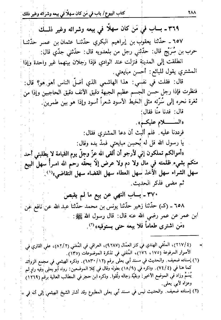 فَلَمْ أَلْبَثْ أَنْ دَعَا الْمُشْتَرِي فَقَالَ: يَا رَسُولَ اللَّهِ، قُلْ لَهُ يُحْسِنُ مُبَايَعَتِي فَمَدَّ يَدَهُ وَقَالَ: «أَمْوَالُكُمْ تَمْلِكُونَ إِنِّي لأَرْجُو أَنْ أَلْقَى اللَّهَ عَزَّ وَجَلَّ يَوْمَ الْقِيَامَةِ لا يَطْلُبُنِي أَحَدٌ مِنْكُمْ بِشَيْءٍ ظَلَمْتُهُ فِي مَالٍ وَلا دَمٍ وَلا عِرْضٍ إِلا بِحَقِّهِ، رَحِمَ اللَّهُ امْرَأً سَهْلَ الْبَيْعِ سَهْلَ الشِّرَاءِ سَهْلَ الأَخْذِ سَهْلَ الْعَطَاءِ سَهْلَ الْقَضَاءِ سَهْلَ التَّقَاضِي» .