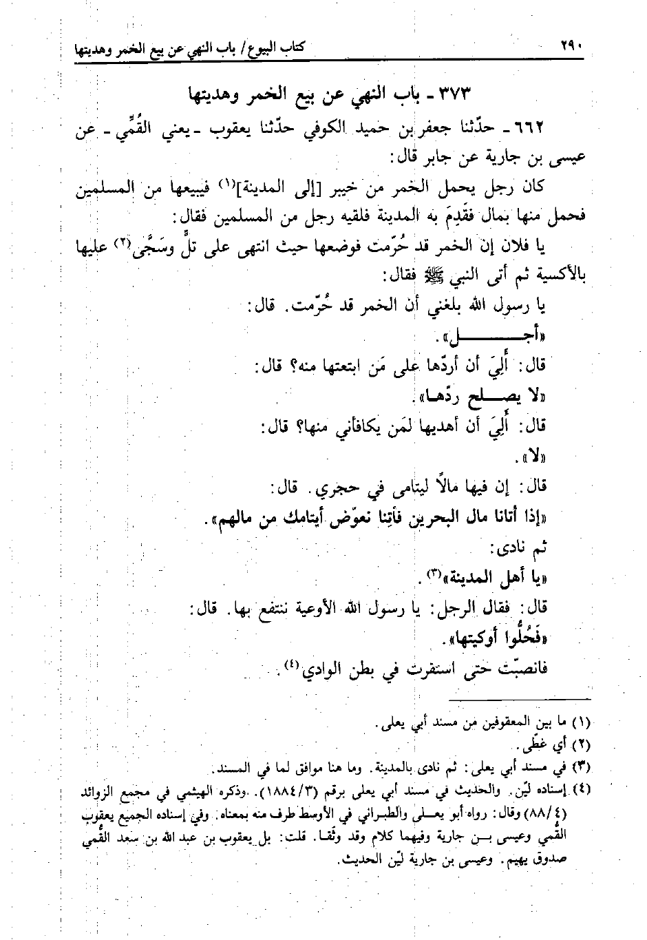 662 - حَدَّثَنَا جَعْفَرُ بْنُ حُمَيْدٍ الْكُوفِيُّ، حَدَّثَنَا يَعْقُوبُ - يَعْنِي: الْقُمِّيَّ، عَنْ عِيسَى بْنِ جَارِيَةَ، عَنْ جَابِرٍ قَالَ: كَانَ رَجُلٌ يَحْمِلُ الْخَمْرَ مِنْ خَيْبَرَ إِلَى الْمَدِينَةِ فَيَبِيعُهَا مِنَ الْمُسْلِمِينَ، فَحَمَلَ مِنْهَا بِمَالٍ فَقَدِمَ بِهِ الْمَدِنيَةَ فَلَقِيَهُ رَجُلٌ مِنَ الْمُسْلِمِينَ فَقَالَ: يَا فُلانُ، إِنَّ الْخَمْرَ قَدْ حُرِّمَتْ؛ فَوَضَعَهَا حَيْثُ انْتَهَى عَلَى تَلٍّ وَسَجَّى عَلَيْهَا بِالأَكْسِيَةِ ثُمَّ أَتَى النَّبِيَّ صَلَّى اللَّهُ عَلَيْهِ وَسَلَّمَ فَقَالَ: يَا رَسُولَ اللَّهِ، بَلَغَنِي أَنَّ الْخَمْرَ قَدْ حُرِّمَتْ.