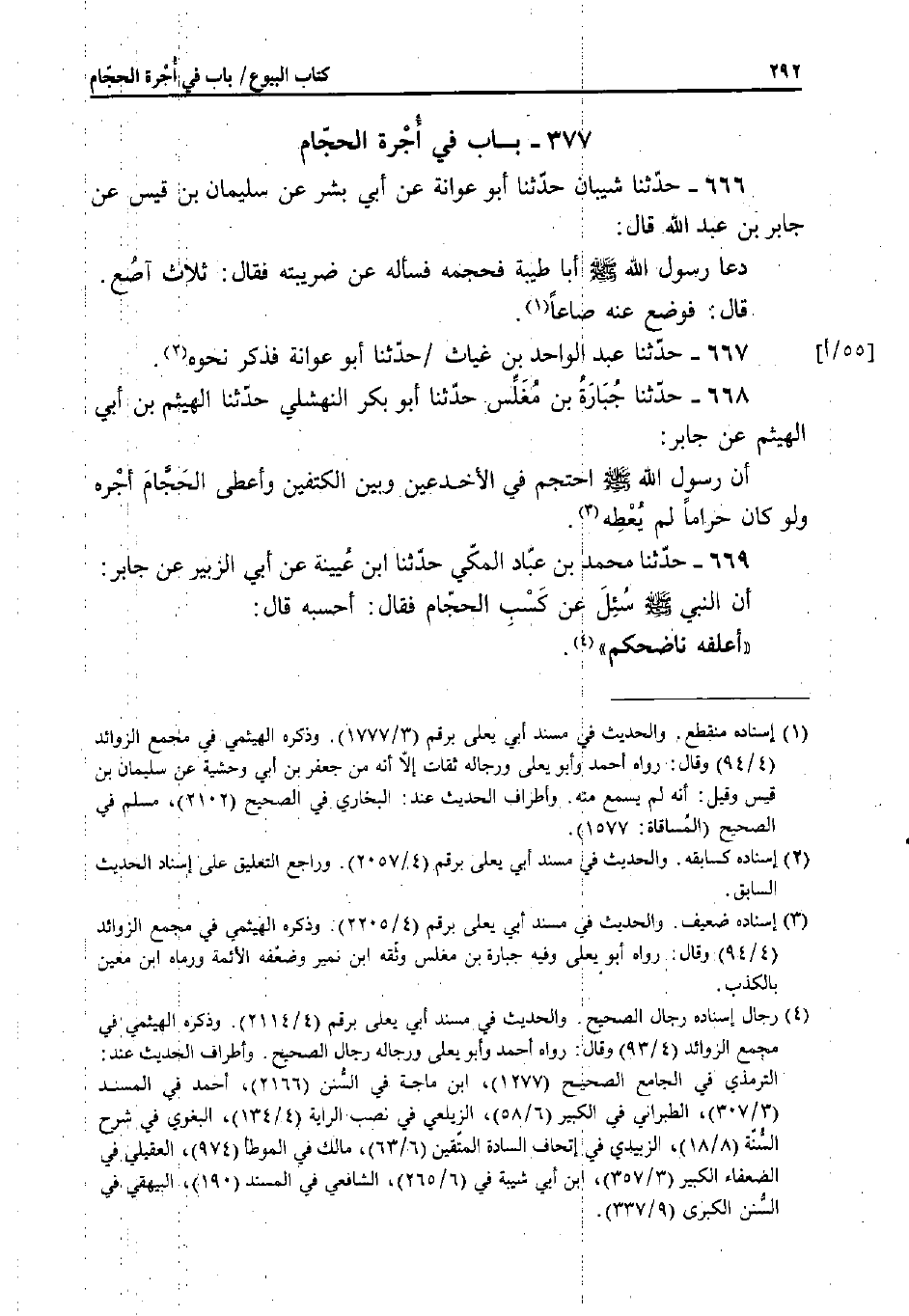 666 - حَدَّثَنَا شَيْبَانُ، حَدَّثَنَا أَبُو عَوَانَةَ، عَنْ أَبِي بِشْرٍ، عَنْ سُلَيْمَانَ بْنِ قَيْسٍ، عَنْ جَابِرِ بْنِ عَبْدِ اللَّهِ قَالَ: دَعَا رَسُولُ اللَّهِ صَلَّى اللَّهُ عَلَيْهِ وَسَلَّمَ أَبَا طَيْبَةَ فَحَجَمَهُ فَسَأَلَهُ، عَنْ ضَرِيبَتِهِ فَقَالَ: ثَلاثُ آصُعٍ.