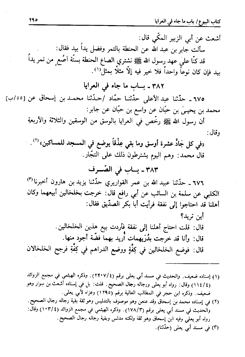 675 - حَدَّثَنَا عَبْدُ الأَعْلَى، حَدَّثَنَا حَمَّادٌ، حَدَّثَنَا مُحَمَّدُ بْنُ إِسْحَاقَ، عَنْ مُحَمَّدِ بْنِ يَحْيَى بْنِ حِبَّانَ، عَنْ وَاسِعِ بْنِ حِبَّانَ، عَنْ جَابِرٍ: أَنَّ رَسُولَ اللَّهِ صَلَّى اللَّهُ عَلَيْهِ وَسَلَّمَ رَخَّصَ فِي الْعَرَايَا بِالْوَسْقِ مِنَ الْوَسْقَيْنِ وَالثَّلاثَةِ وَالأَرْبَعَةِ وَقَالَ: «فِي كُلِّ جَادٍّ عَشَرَةُ أَوْسُقٍ، وَمَا بَقِيَ عِذْقًا يُوضَعُ فِي الْمَسْجِدِ لِلْمَسَاكِينِ» .