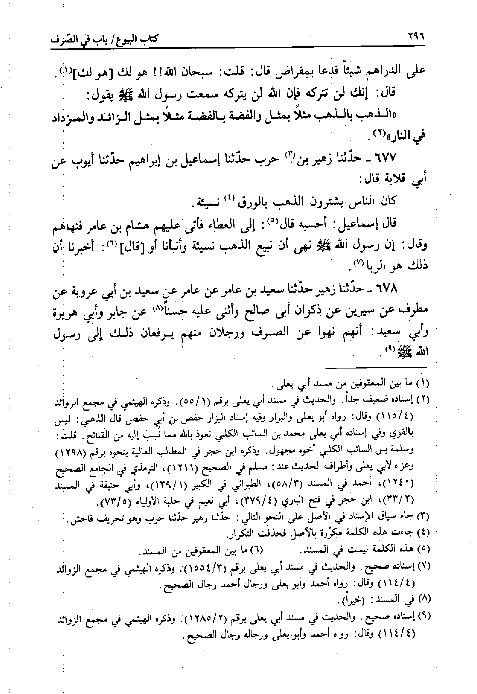 678 - حَدَّثَنَا زُهَيْرٌ، حَدَّثَنَا سَعِيدُ بْنُ عَامِرٍ، عَنْ عَامِرٍ، عَنْ سَعِيدِ بْنِ أَبِي عُرْوَةَ، عَنْ مُطَرِّفٍ، عَنْ سِيرِينَ، عَنْ ذَكْوَانَ أَبِي صَالِحٍ وَأَثْنَى عَلَيْهِ حُسْنًا، عَنْ جَابِرٍ، وَأَبِي هُرَيْرَةَ، وَأَبِي سَعِيدٍ: أَنَّهُمْ نُهُوا عَنِ الصَّرْفِ وَرَجُلانِ مِنْهُمْ يَرْفَعَانِ ذَلِكَ إِلَى رَسُولِ اللَّهِ صَلَّى اللَّهُ عَلَيْهِ وَسَلَّمَ.