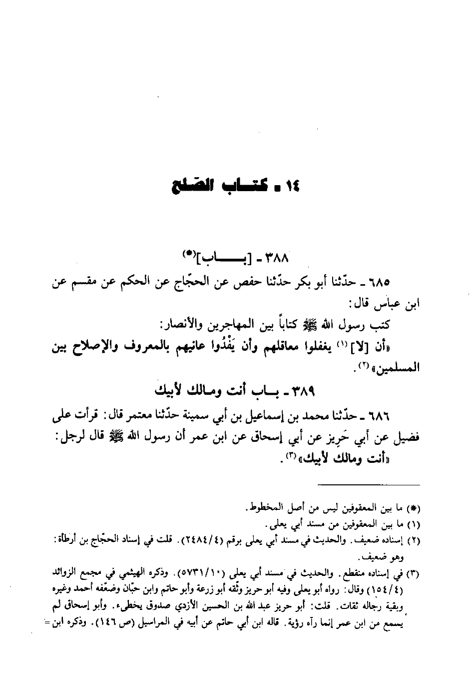 685 - حَدَّثَنَا أَبُو بَكْرٍ، حَدَّثَنَا حَفْصٌ، عَنِ الْحَجَّاجِ، عَنِ الْحَكَمِ، عَنْ مِقْسَمٍ، عَنِ ابْنِ عَبَّاسٍ قَالَ: كَتَبَ رَسُولُ اللَّهِ صَلَّى اللَّهُ عَلَيْهِ وَسَلَّمَ كِتَابًا بَيْنَ الْمُهَاجِرِينَ وَالأَنْصَارِ: «أَنْ لا يَعْقِلُوا مَعَاقِلَهُمْ، وَأَنْ يَفْدُوا عَانِيَهُمْ بِالْمَعْرُوفِ وَالإِصْلاحِ بَيْنَ الْمُسْلِمِينَ» .