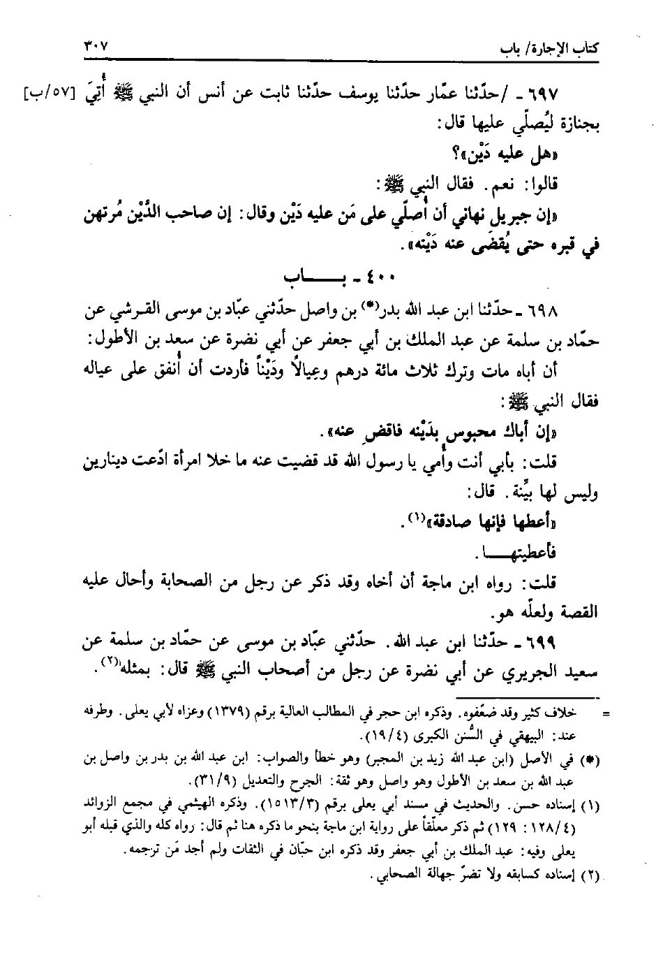 698 - حَدَّثَنَا ابْنُ عَبْدِ اللَّهِ بْنِ بَدْرِ بْنِ وَاصِلٍ، حَدَّثَنِي عَبَّادُ بْنُ مُوسَى الْقُرَشِيُّ، عَنْ حَمَّادِ بْنِ سَلَمَةَ، عَنْ عَبْدِ الْمَلِكِ بْنِ أَبِي جَعْفَرٍ، عَنْ أَبِي نَضْرَةَ، عَنْ سَعْدِ بْنِ الأَطْوَلِ: أَنَّ أَبَاهُ مَاتَ وَتَرَكَ ثَلاثَ مِائَةِ دِرْهَمٍ وَعِيَالا فَأَرَدْتُ أَنْ أُنْفِقَ عَلَى عِيَالِهِ فَقَالَ النَّبِيُّ صَلَّى اللَّهُ عَلَيْهِ وَسَلَّمَ: «إِنَّ أَبَاكَ مَحْبُوسٌ بِدَيْنِهِ فَاقْضِ عَنْهُ» .
