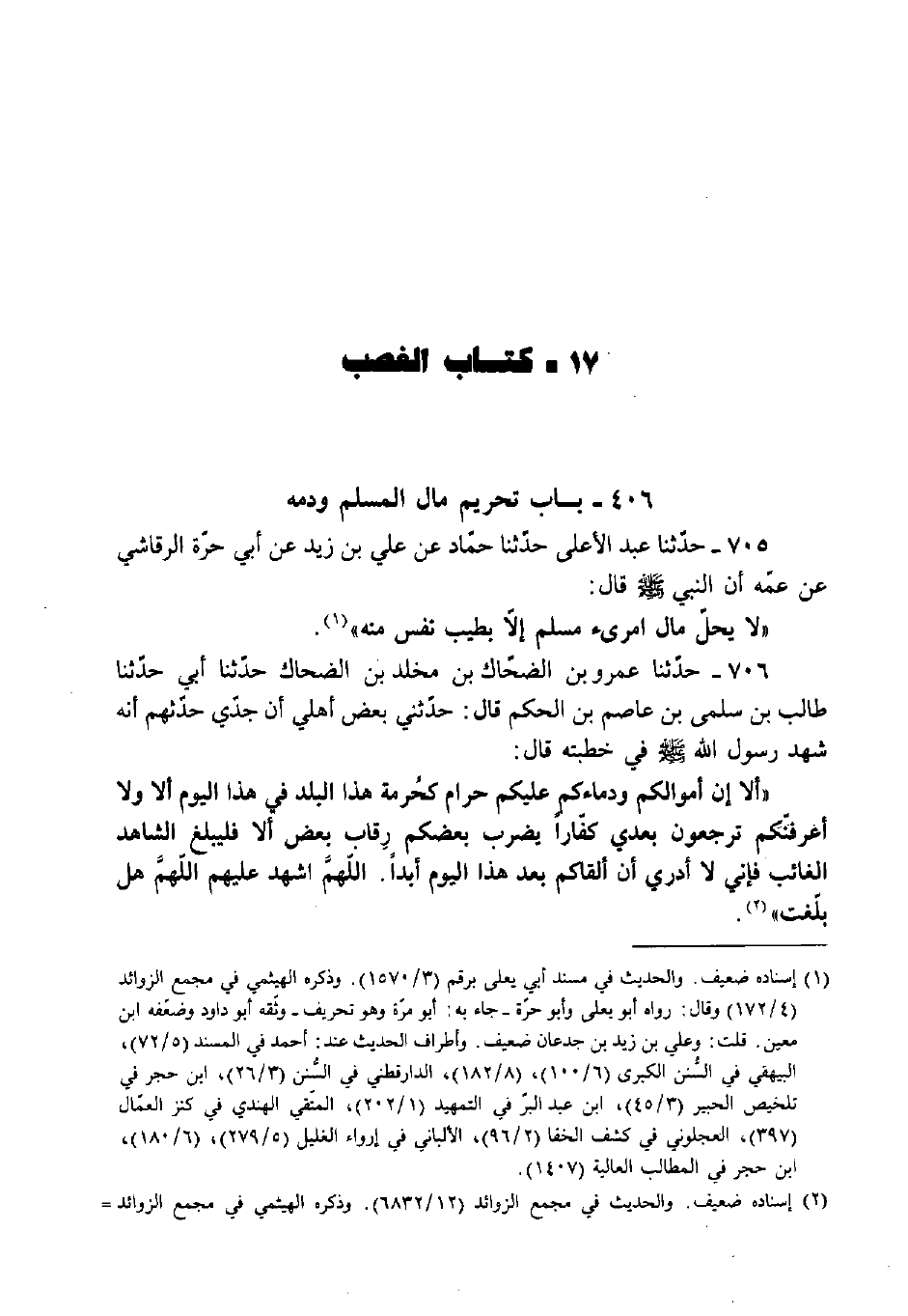 705 - حَدَّثَنَا عَبْدُ الأَعْلَى، حَدَّثَنَا حَمَّادٌ، عَنْ عَلِيِّ بْنِ زَيْدٍ، عَنْ أَبِي حُرَّةَ الرَّقَاشِيِّ، عَنْ عَمِّهِ أَنَّ النَّبِيَّ صَلَّى اللَّهُ عَلَيْهِ وَسَلَّمَ قَالَ: «لا يَحِلُّ مَالُ امْرِئٍ مُسْلِمٍ إِلا بِطِيبِ نَفْسٍ مِنْهُ» .