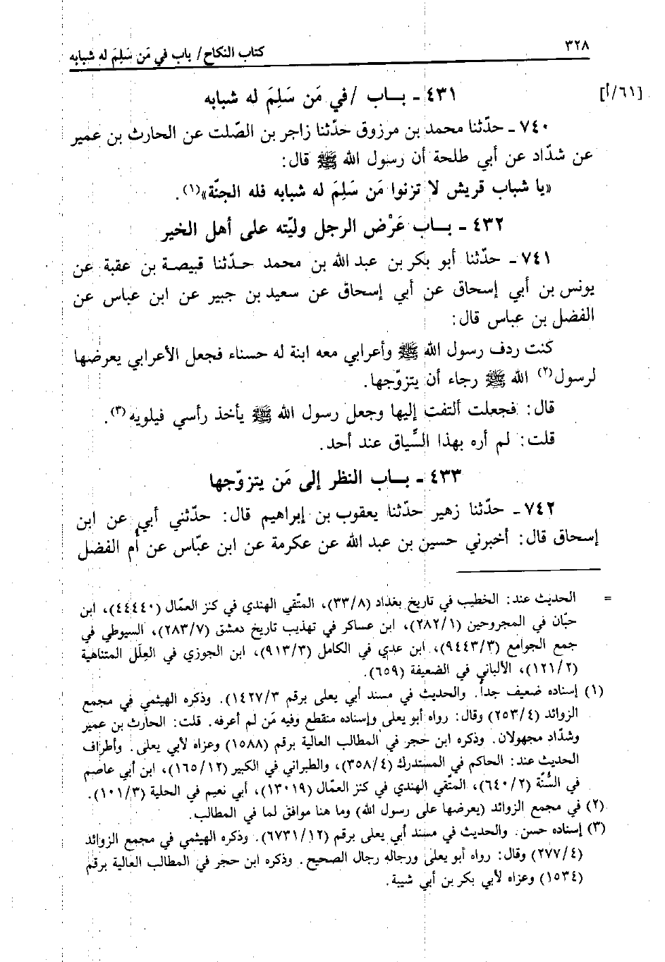 741 - حَدَّثَنَا أَبُو بَكْرِ بْنُ عَبْدِ اللَّهِ بْنِ مُحَمَّدٍ، حَدَّثَنَا قَبِيصَةُ بْنُ عُقْبَةَ، عَنْ يُونُسَ بْنِ أَبِي إِسْحَاقَ، عَنْ سَعِيدِ بْنِ جُبَيْرٍ، عَنِ ابْنِ عَبَّاسٍ، عَنْ الْفَضْلِ بْنِ عَبَّاسٍ قَالَ: كُنْتُ رِدْفَ رَسُولِ اللَّهِ صَلَّى اللَّهُ عَلَيْهِ وَسَلَّمَ وَأَعْرَابِيٌّ مَعَهُ ابْنَةٌ لَهُ حَسْنَاءُ؛ فَجَعَلَ الأَعْرَابِيُّ يَعْرِضُهَا لِرَسُولِ اللَّهِ صَلَّى اللَّهُ عَلَيْهِ وَسَلَّمَ رَجَاءَ أَنْ يَتَزَوَّجَهَا.