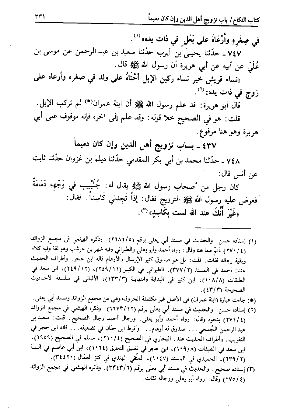 748 - حَدَّثَنَا مُحَمَّدُ بْنُ أَبِي بَكْرٍ الْمُقَدَّمِيُّ، حَدَّثَنَا دَيْلَمُ بْنُ غَزْوَانَ، حَدَّثَنَا ثَابِتٌ، عَنْ أَنَسٍ قَالَ: كَانَ رَجُلٌ مِنْ أَصْحَابِ رَسُولِ اللَّهِ صَلَّى اللَّهُ عَلَيْهِ وَسَلَّمَ يُقَالُ لَهُ: جُلَيْبِيبٌ فِي وَجْهِهِ دَمَامَةٌ، فَعَرَضَ عَلَيْهِ رَسُولُ اللَّهِ صَلَّى اللَّهُ عَلَيْهِ وَسَلَّمَ التَّزْوِيجَ، فَقَالَ: إِذًا تَجِدُنِي كَاسِدًا.