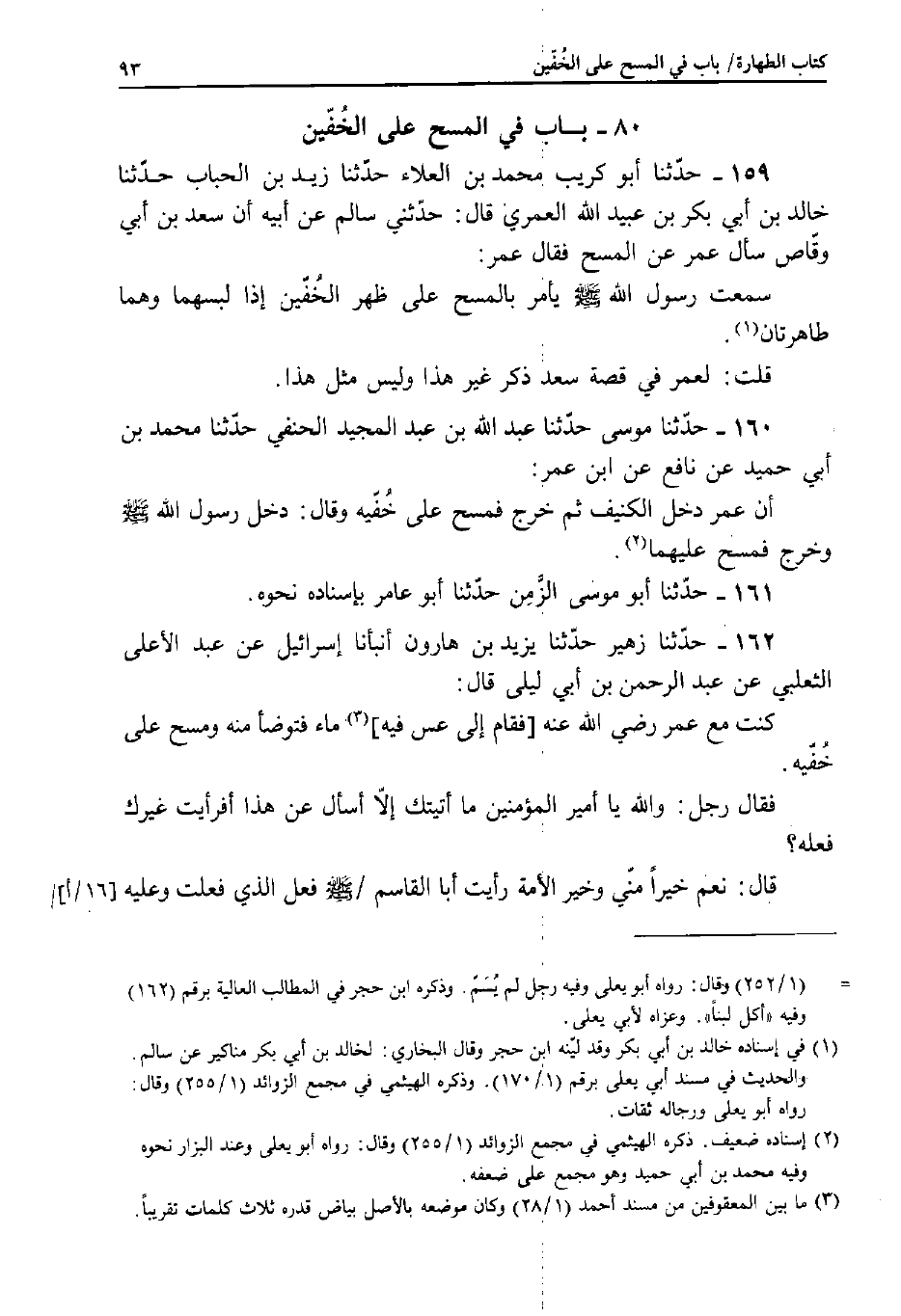 159 - حَدَّثَنَا أَبُو كُرَيْبٍ مُحَمَّدُ بْنُ الْعَلاءِ، حَدَّثَنَا زَيْدُ بْنُ الْحُبَابِ، حَدَّثَنَا خَالِدُ بْنُ أَبِي بَكْرِ بْنِ عُبَيْدِ اللَّهِ الْعُمَرِيُّ، قَالَ: حَدَّثَنِي سَالِمٌ، عَنْ أَبِيهِ: أَنَّ سَعْدَ بْنَ أَبِي وَقَّاصٍ سَأَلَ عُمَرَ عَنِ الْمَسْحِ فَقَالَ عُمَرُ: سَمِعْتُ رَسُولَ اللَّهِ صَلَّى اللَّهُ عَلَيْهِ وَسَلَّمَ يَأْمُرُ بِالْمَسْحِ عَلَى ظَهْرِ الْخُفَّيْنِ إِذَا لَبِسَهُمَا وَهُمَا طَاهِرَتَانِ.
