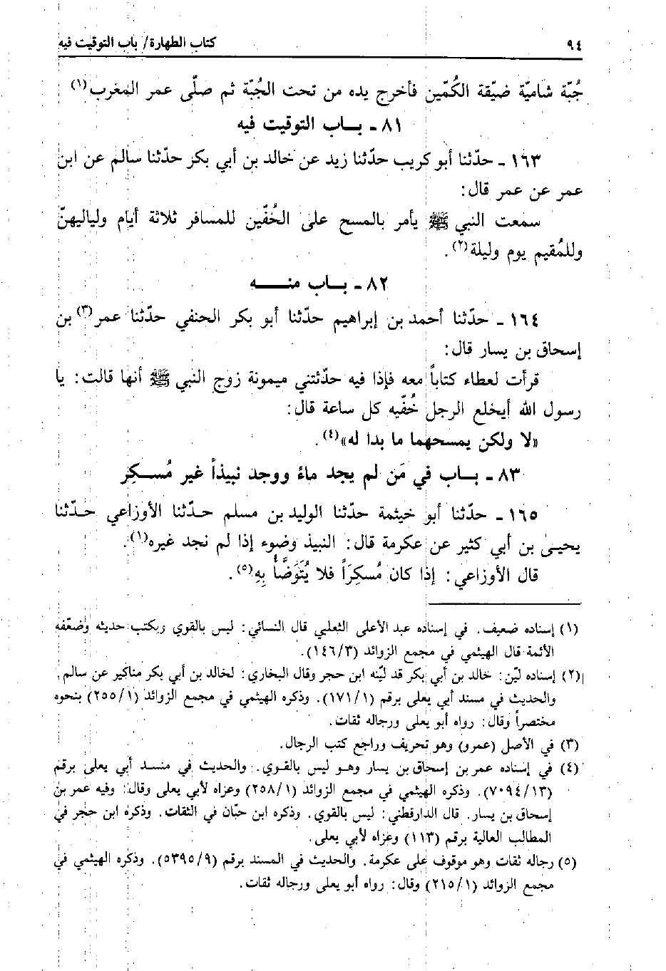 164 - حَدَّثَنَا أَحْمَدُ بْنُ إِبْرَاهِيمَ، حَدَّثَنَا أَبُو بَكْرٍ الْحَنَفِيُّ، حَدَّثَنَا عُمَرُ بْنُ إِسْحَاقَ بْنِ يَسَارٍ قَالَ: قَرَأْتُ لِعَطَاءٍ كِتَابًا مَعَهُ، فَإِذَا فِيهِ: حَدَّثَتْنِي مَيْمُونَةُ زَوْجُ النَّبِيِّ صَلَّى اللَّهُ عَلَيْهِ وَسَلَّمَ أَنَّهَا قَالَتْ: يَا رَسُولَ اللَّهِ، أَيَخْلَعُ الرَّجُلُ خُفَّيْهِ كُلَّ سَاعَةٍ قَالَ: «لا وَلَكِنْ يَمْسَحُهُمَا مَا بَدَا لَهُ» .