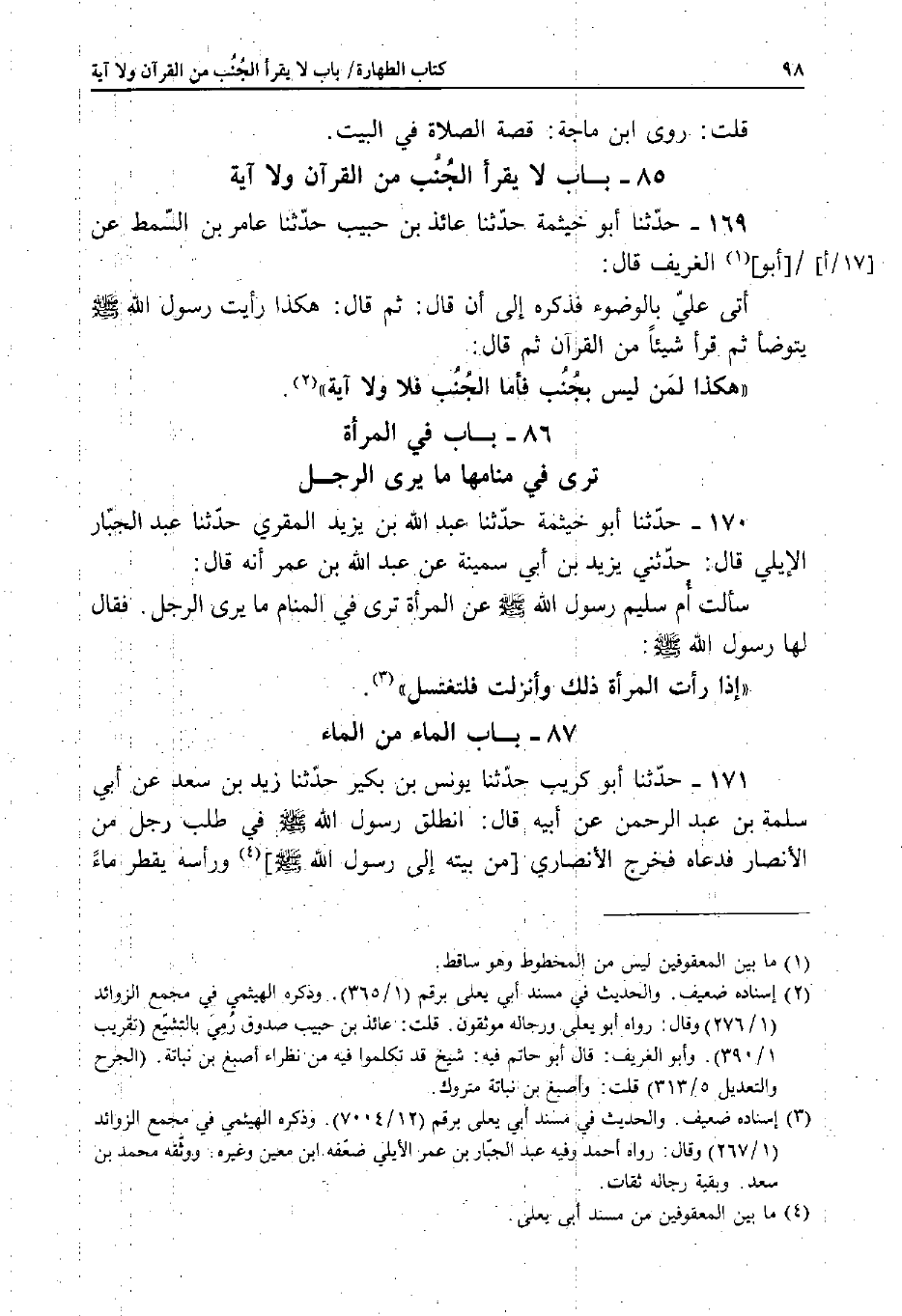 170 - حَدَّثَنَا أَبُو خَيْثَمَةَ، حَدَّثَنَا عَبْدُ اللَّهِ بْنُ يَزِيدَ الْمُقْرِئُ، حَدَّثَنَا عَبْدُ الْجَبَّارِ الأَيْلِيُّ قَالَ: حَدَّثَنِي يَزِيدُ بْنُ أَبِي سُمَيْنَةَ، عَنْ عَبْدِ اللَّهِ بْنِ عُمَرَ أَنَّهُ قَالَ: سَأَلَتْ أُمُّ سُلَيْمٍ رَسُولَ اللَّهِ صَلَّى اللَّهُ عَلَيْهِ وَسَلَّمَ، عَنِ الْمَرْأَةِ تَرَى فِي الْمَنَامِ مَا يَرَى الرَّجُلُ.
