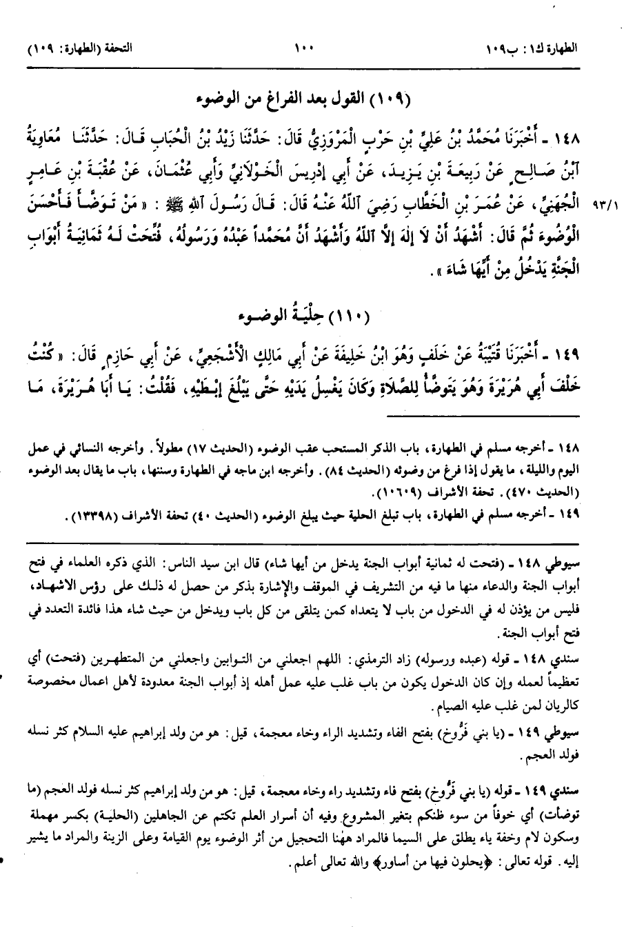 الْقَوْلُ بَعْدَ الْفَرَاغِ مِنْ الْوُضُوءِ 148 - أَخْبَرَنَا مُحَمَّدُ بْنُ عَلِيِّ بْنِ حَرْبٍ الْمَرْوَزِيُّ قَالَ حَدَّثَنَا زَيْدُ بْنُ الْحُبَابِ قَالَ حَدَّثَنَا مُعَاوِيَةُ بْنُ صَالِحٍ عَنْ رَبِيعَةَ بْنِ يَزِيدَ عَنْ أَبِي إِدْرِيسَ الْخَوْلَانِيِّ وَأَبِي عُثْمَانَ عَنْ عُقْبَةَ بْنِ عَامِرٍ الْجُهَنِيِّ عَنْ عُمَرَ بْنِ الْخَطَّابِ رَضِيَ اللَّهُ عَنْهُ قَالَ قَالَ رَسُولُ اللَّهِ صَلَّى اللَّهُ عَلَيْهِ وَسَلَّمَ مَنْ تَوَضَّأَ فَأَحْسَنَ الْوُضُوءَ ثُمَّ قَالَ أَشْهَدُ أَنْ لَا إِلَهَ إِلَّا اللَّهُ وَأَشْهَدُ أَنَّ مُحَمَّدًا عَبْدُهُ وَرَسُولُهُ فُتِّحَتْ لَهُ ثَمَانِيَةُ أَبْوَابِ الْجَنَّةِ يَدْخُلُ مِنْ أَيِّهَا شَاءَ