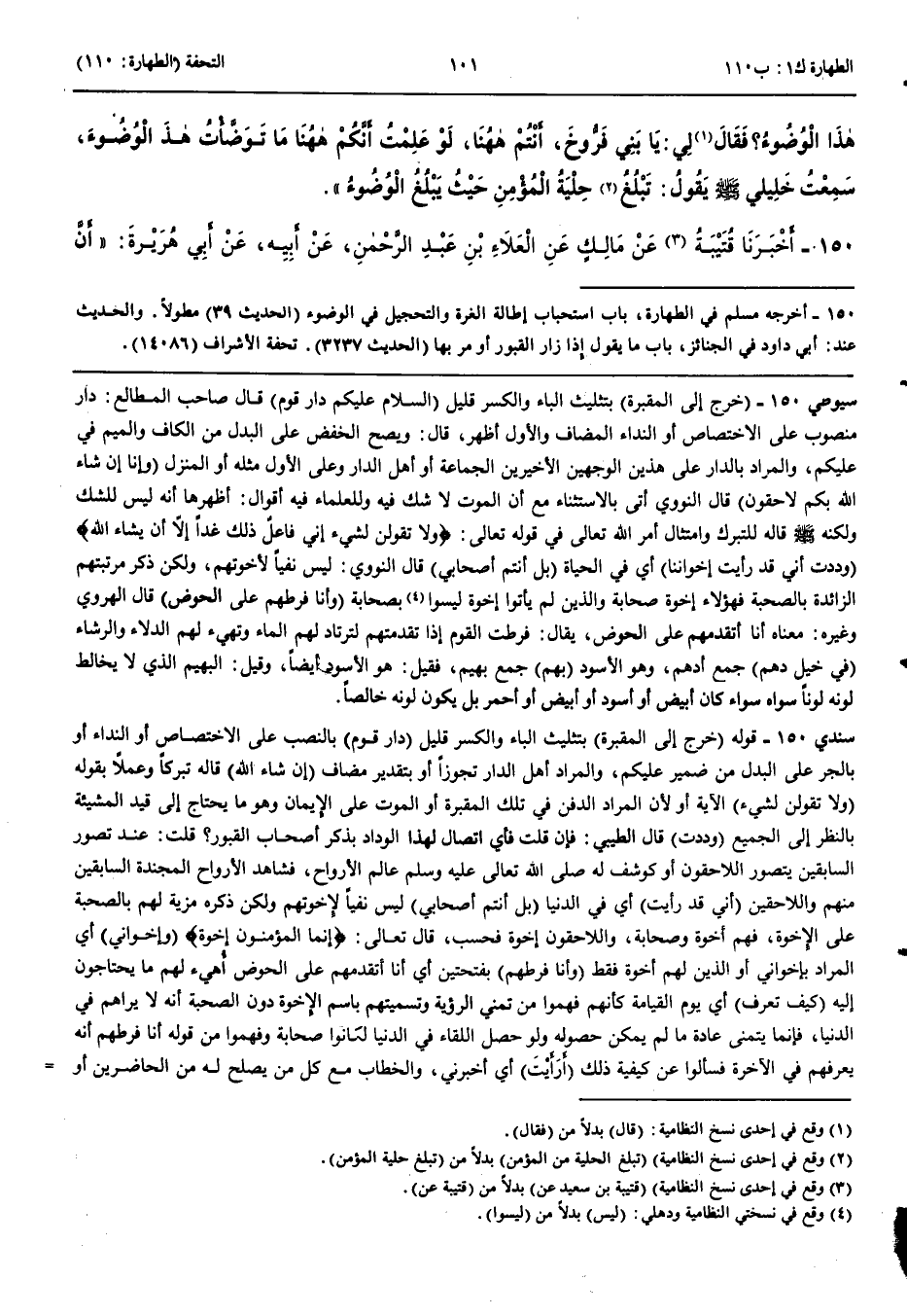 150 - أَخْبَرَنَا قُتَيْبَةُ عَنْ مَالِكٍ عَنْ الْعَلَاءِ بْنِ عَبْدِ الرَّحْمَنِ عَنْ أَبِيهِ عَنْ أَبِي هُرَيْرَةَ أَنَّ رَسُولَ اللَّهِ صَلَّى اللَّهُ عَلَيْهِ وَسَلَّمَ خَرَجَ إِلَى الْمَقْبُرَةِ فَقَالَ السَّلَامُ عَلَيْكُمْ دَارَ قَوْمٍ مُؤْمِنِينَ وَإِنَّا إِنْ شَاءَ اللَّهُ بِكُمْ لَاحِقُونَ وَدِدْتُ أَنِّي قَدْ رَأَيْتُ إِخْوَانَنَا قَالُوا يَا رَسُولَ اللَّهِ أَلَسْنَا إِخْوَانَكَ قَالَ بَلْ أَنْتُمْ أَصْحَابِي وَإِخْوَانِي الَّذِينَ لَمْ يَأْتُوا بَعْدُ وَأَنَا فَرَطُهُمْ عَلَى الْحَوْضِ قَالُوا يَا رَسُولَ اللَّهِ كَيْفَ تَعْرِفُ مَنْ يَأْتِي بَعْدَكَ مِنْ أُمَّتِكَ قَالَ أَرَأَيْتَ لَوْ كَانَ لِرَجُلٍ خَيْلٌ غُرٌّ مُحَجَّلَةٌ فِي خَيْلٍ بُهْمٍ دُهْمٍ أَلَا يَعْرِفُ خَيْلَهُ قَالُوا بَلَى قَالَ فَإِنَّهُمْ يَأْتُونَ يَوْمَ الْقِيَامَةِ غُرًّا مُحَجَّلِينَ مِنْ الْوُضُوءِ وَأَنَا فَرَطُهُمْ عَلَى الْحَوْضِ