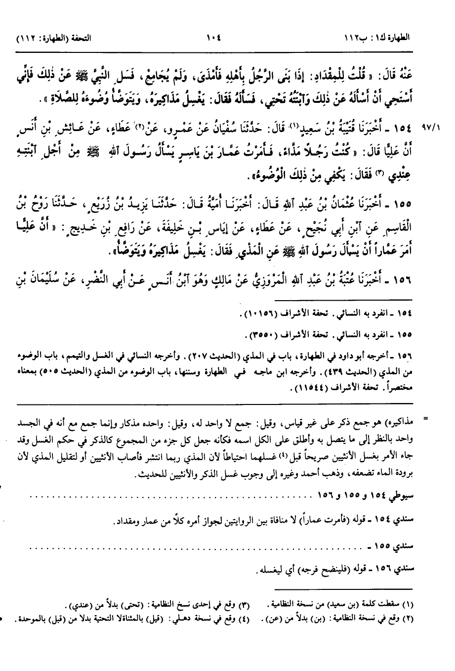 154 - أَخْبَرَنَا قُتَيْبَةُ بْنُ سَعِيدٍ قَالَ حَدَّثَنَا سُفْيَانُ عَنْ عَمْرٍو عَنْ عَطَاءٍ عَنْ عَائِشِ بْنِ أَنَسٍ أَنَّ عَلِيًا قَالَ كُنْتُ رَجُلًا مَذَّاءً فَأَمَرْتُ عَمَّارَ بْنَ يَاسِرٍ يَسْأَلُ رَسُولَ اللَّهِ صَلَّى اللَّهُ عَلَيْهِ وَسَلَّمَ مِنْ أَجْلِ ابْنَتِهِ عِنْدِي فَقَالَ يَكْفِي مِنْ ذَلِكَ الْوُضُوءُ