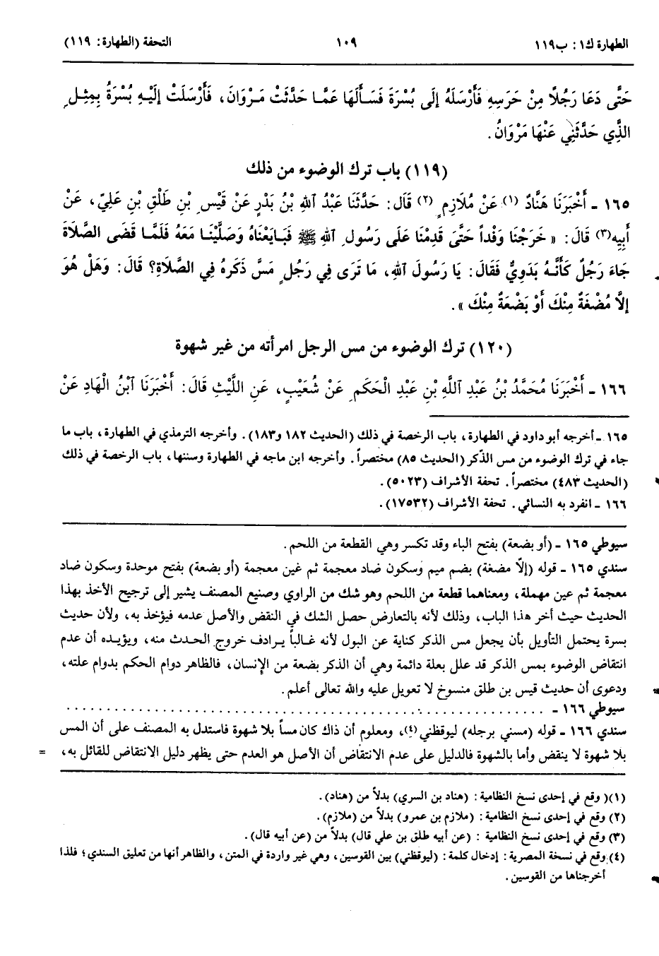 بَاب تَرْكِ الْوُضُوءِ مِنْ ذَلِكَ 165 - أَخْبَرَنَا هَنَّادٌ عَنْ مُلَازِمٍ قَالَ حَدَّثَنَا عَبْدُ اللَّهِ بْنُ بَدْرٍ عَنْ قَيْسِ بْنِ طَلْقِ بْنِ عَلِيٍّ عَنْ أَبِيهِ قَالَ خَرَجْنَا وَفْدًا حَتَّى قَدِمْنَا عَلَى رَسُولِ اللَّهِ صَلَّى اللَّهُ عَلَيْهِ وَسَلَّمَ فَبَايَعْنَاهُ وَصَلَّيْنَا مَعَهُ فَلَمَّا قَضَى الصَّلَاةَ جَاءَ رَجُلٌ كَأَنَّهُ بَدَوِيٌّ فَقَالَ يَا رَسُولَ اللَّهِ مَا تَرَى فِي رَجُلٍ مَسَّ ذَكَرَهُ فِي الصَّلَاةِ قَالَ وَهَلْ هُوَ إِلَّا مُضْغَةٌ مِنْكَ أَوْ بَضْعَةٌ مِنْكَ