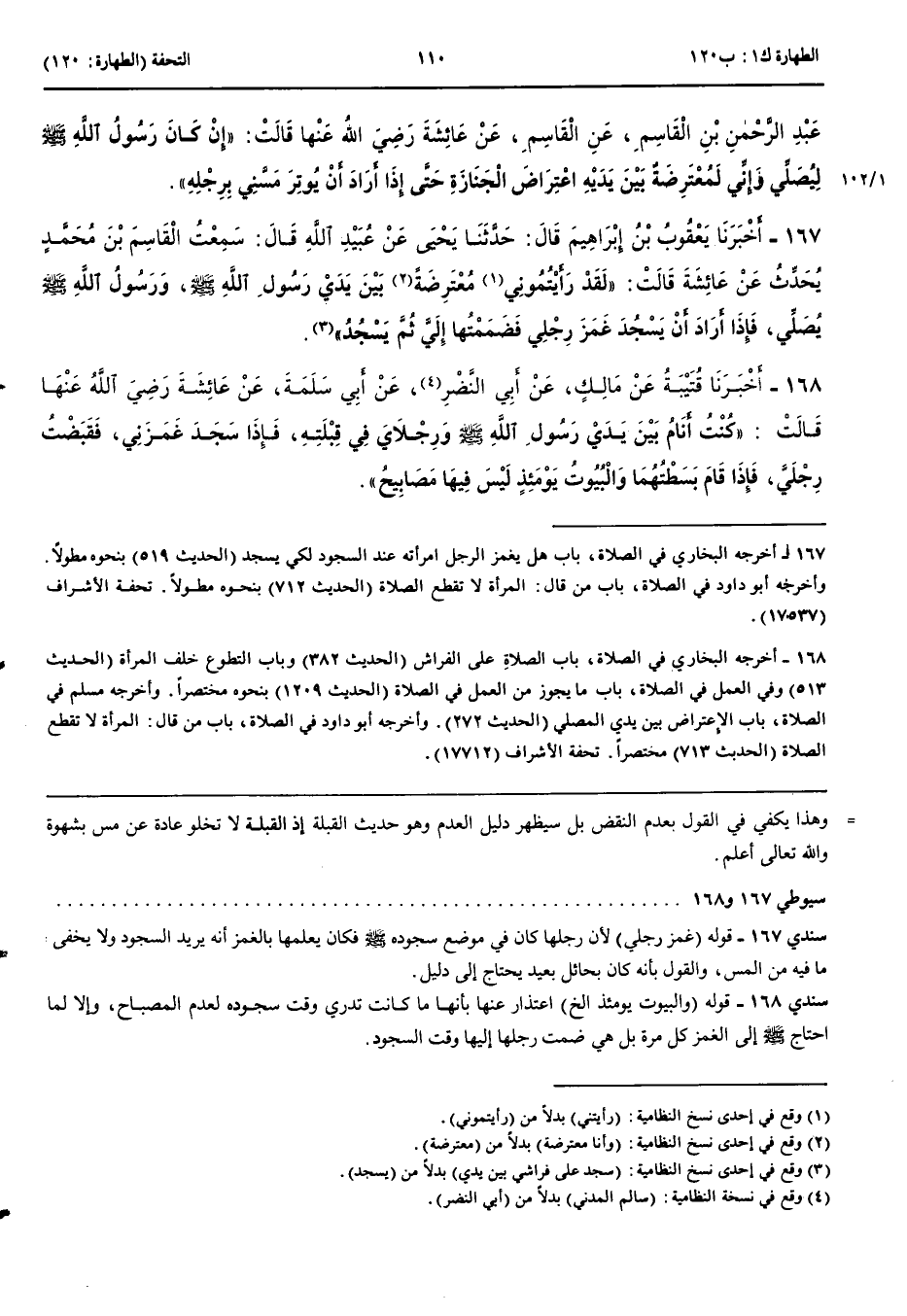 167 - أَخْبَرَنَا يَعْقُوبُ بْنُ إِبْرَاهِيمَ قَالَ حَدَّثَنَا يَحْيَى عَنْ عُبَيْدِ اللَّهِ قَالَ سَمِعْتُ الْقَاسِمَ بْنَ مُحَمَّدٍ يُحَدِّثُ عَنْ عَائِشَةَ قَالَتْ لَقَدْ رَأَيْتُمُونِي مُعْتَرِضَةً بَيْنَ يَدَيْ رَسُولِ اللَّهِ صَلَّى اللَّهُ عَلَيْهِ وَسَلَّمَ وَرَسُولُ اللَّهِ صَلَّى اللَّهُ عَلَيْهِ وَسَلَّمَ يُصَلِّي فَإِذَا أَرَادَ أَنْ يَسْجُدَ غَمَزَ رِجْلِي فَضَمَمْتُهَا إِلَيَّ ثُمَّ يَسْجُدُ