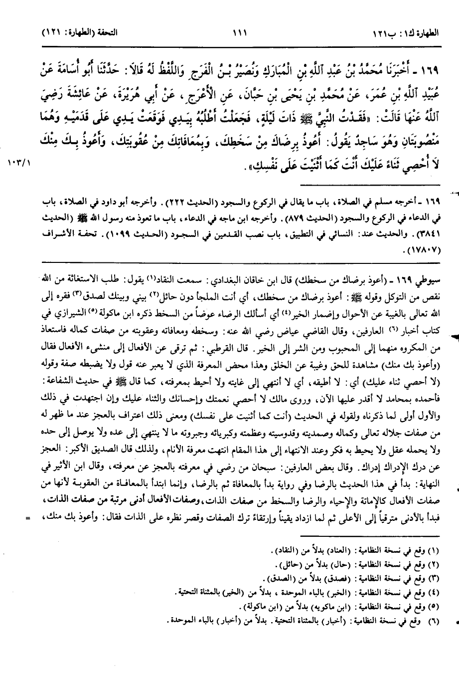 169 - أَخْبَرَنَا مُحَمَّدُ بْنُ عَبْدِ اللَّهِ بْنِ الْمُبَارَكِ وَنُصَيْرُ بْنُ الْفَرَجِ وَاللَّفْظُ لَهُ قَالَا حَدَّثَنَا أَبُو أُسَامَةَ عَنْ عُبَيْدِ اللَّهِ بْنِ عُمَرَ عَنْ مُحَمَّدِ بْنِ يَحْيَى بْنِ حَبَّانَ عَنْ الْأَعْرَجِ عَنْ أَبِي هُرَيْرَةَ عَنْ عَائِشَةَ رَضِيَ اللَّهُ عَنْهَا قَالَتْ فَقَدْتُ النَّبِيَّ صَلَّى اللَّهُ عَلَيْهِ وَسَلَّمَ ذَاتَ لَيْلَةٍ فَجَعَلْتُ أَطْلُبُهُ بِيَدِي فَوَقَعَتْ يَدِي عَلَى قَدَمَيْهِ وَهُمَا مَنْصُوبَتَانِ وَهُوَ سَاجِدٌ يَقُولُ أَعُوذُ بِرِضَاكَ مِنْ سَخَطِكَ وَبِمُعَافَاتِكَ مِنْ عُقُوبَتِكَ وَأَعُوذُ بِكَ مِنْكَ لَا أُحْصِي ثَنَاءً عَلَيْكَ أَنْتَ كَمَا أَثْنَيْتَ عَلَى نَفْسِكَ