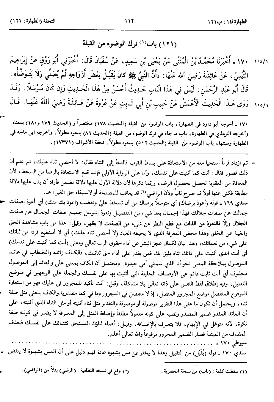 تَرْكُ الْوُضُوءِ مِنْ الْقُبْلَةِ 170 - أَخْبَرَنَا مُحَمَّدُ بْنُ الْمُثَنَّى عَنْ يَحْيَى بْنِ سَعِيدٍ عَنْ سُفْيَانَ قَالَ أَخْبَرَنِي أَبُو رَوْقٍ عَنْ إِبْرَاهِيمَ التَّيْمِيِّ عَنْ عَائِشَةَ أَنَّ النَّبِيَّ صَلَّى اللَّهُ عَلَيْهِ وَسَلَّمَ كَانَ يُقَبِّلُ بَعْضَ أَزْوَاجِهِ ثُمَّ يُصَلِّي وَلَا يَتَوَضَّأُ قَالَ أَبُو عَبْد الرَّحْمَنِ لَيْسَ فِي هَذَا الْبَابِ حَدِيثٌ أَحْسَنُ مِنْ هَذَا الْحَدِيثِ وَإِنْ كَانَ مُرْسَلًا وَقَدْ رَوَى هَذَا الْحَدِيثَ الْأَعْمَشُ عَنْ حَبِيبِ بْنِ أَبِي ثَابِتٍ عَنْ عُرْوَةَ عَنْ عَائِشَةَ قَالَ يَحْيَى الْقَطَّانُ حَدِيثُ حَبِيبٍ عَنْ عُرْوَةَ عَنْ عَائِشَةَ هَذَا وَحَدِيثُ حَبِيبٍ عَنْ عُرْوَةَ عَنْ عَائِشَةَ تُصَلِّ وَإِنْ قَطَرَ الدَّمُ عَلَى الْحَصِيرِ لَا شَيْءَ