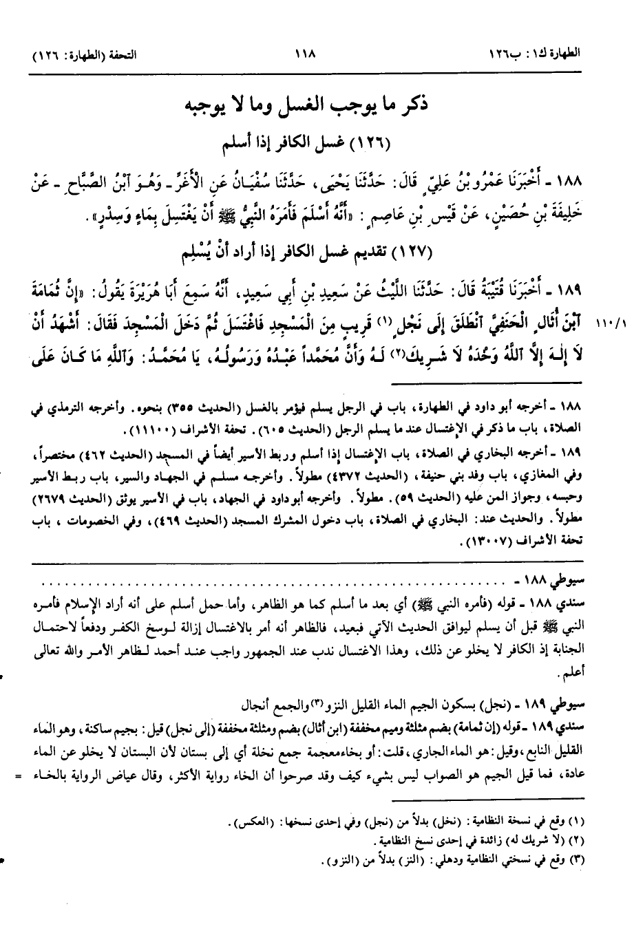 تَقْدِيمُ غُسْلِ الْكَافِرِ إِذَا أَرَادَ أَنْ يُسْلِمَ 189 - أَخْبَرَنَا قُتَيْبَةُ قَالَ حَدَّثَنَا اللَّيْثُ عَنْ سَعِيدِ بْنِ أَبِي سَعِيدٍ أَنَّهُ سَمِعَ أَبَا هُرَيْرَةَ يَقُولُ إِنَّ ثُمَامَةَ بْنَ أُثَالٍ الْحَنَفِيَّ انْطَلَقَ إِلَى نَجْلٍ قَرِيبٍ مِنْ الْمَسْجِدِ فَاغْتَسَلَ ثُمَّ دَخَلَ الْمَسْجِدَ فَقَالَ أَشْهَدُ أَنْ لَا إِلَهَ إِلَّا اللَّهُ وَحْدَهُ لَا شَرِيكَ لَهُ وَأَنَّ مُحَمَّدًا عَبْدُهُ وَرَسُولُهُ يَا مُحَمَّدُ وَاللَّهِ مَا كَانَ عَلَى الْأَرْضِ وَجْهٌ أَبْغَضَ إِلَيَّ مِنْ وَجْهِكَ فَقَدْ أَصْبَحَ وَجْهُكَ أَحَبَّ الْوُجُوهِ كُلِّهَا إِلَيَّ وَإِنَّ خَيْلَكَ أَخَذَتْنِي وَأَنَا أُرِيدُ الْعُمْرَةَ فَمَاذَا تَرَى فَبَشَّرَهُ رَسُولُ اللَّهِ صَلَّى اللَّهُ عَلَيْهِ وَسَلَّمَ وَأَمَرَهُ أَنْ يَعْتَمِرَ مُخْتَصَرٌ
