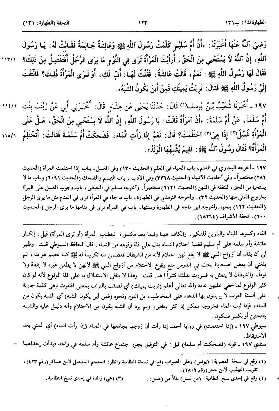 197 - أَخْبَرَنَا شُعَيْبُ بْنُ يُوسُفَ قَالَ حَدَّثَنَا يَحْيَى عَنْ هِشَامٍ قَالَ أَخْبَرَنِي أَبِي عَنْ زَيْنَبَ بِنْتِ أُمِّ سَلَمَةَ عَنْ أُمِّ سَلَمَةَ أَنَّ امْرَأَةً قَالَتْ يَا رَسُولَ اللَّهِ إِنَّ اللَّهَ لَا يَسْتَحْيِي مِنْ الْحَقِّ هَلْ عَلَى الْمَرْأَةِ غُسْلٌ إِذَا هِيَ احْتَلَمَتْ قَالَ نَعَمْ إِذَا رَأَتْ الْمَاءَ فَضَحِكَتْ أُمُّ سَلَمَةَ فَقَالَتْ أَتَحْتَلِمُ الْمَرْأَةُ فَقَالَ رَسُولُ اللَّهِ صَلَّى اللَّهُ عَلَيْهِ وَسَلَّمَ فَفِيمَ يُشْبِهُهَا الْوَلَدُ