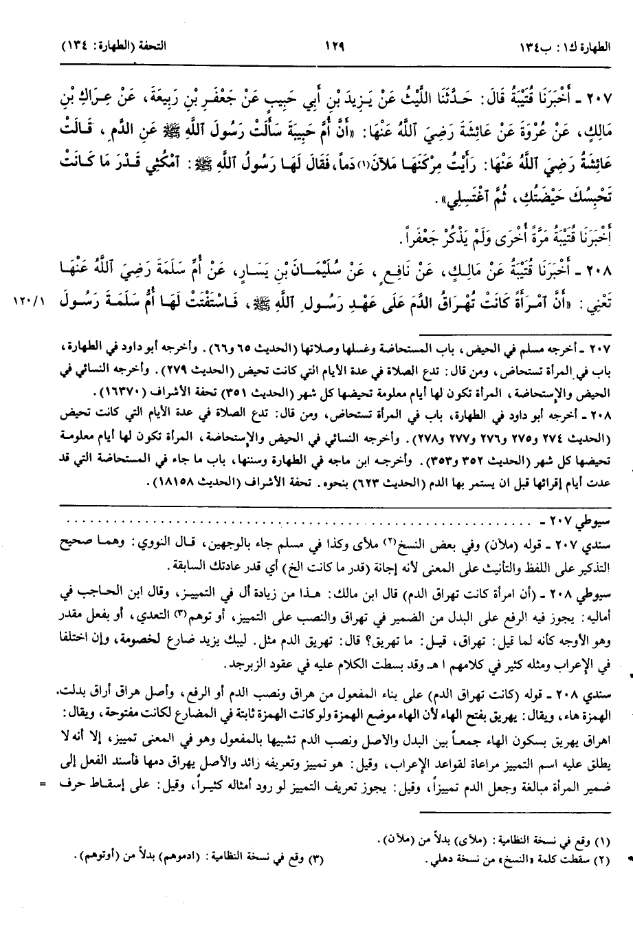 207 - أَخْبَرَنَا قُتَيْبَةُ قَالَ حَدَّثَنَا اللَّيْثُ عَنْ يَزِيدَ بْنِ أَبِي حَبِيبٍ عَنْ جَعْفَرِ بْنِ رَبِيعَةَ عَنْ عِرَاكِ بْنِ مَالِكٍ عَنْ عُرْوَةَ عَنْ عَائِشَةَ أَنَّ أُمَّ حَبِيبَةَ سَأَلَتْ رَسُولَ اللَّهِ صَلَّى اللَّهُ عَلَيْهِ وَسَلَّمَ عَنْ الدَّمِ قَالَتْ عَائِشَةُ رَضِيَ اللَّهُ عَنْهَا رَأَيْتُ مِرْكَنَهَا مَلْآنَ دَمًا فَقَالَ لَهَا رَسُولُ اللَّهِ صَلَّى اللَّهُ عَلَيْهِ وَسَلَّمَ امْكُثِي قَدْرَ مَا كَانَتْ تَحْبِسُكِ حَيْضَتُكِ ثُمَّ اغْتَسِلِي أَخْبَرَنَا قُتَيْبَةُ مَرَّةً أُخْرَى وَلَمْ يَذْكُرْ جَعْفَرًا