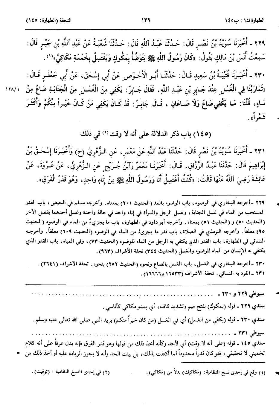 229 - أَخْبَرَنَا سُوَيْدُ بْنُ نَصْرٍ قَالَ أَنْبَأَنَا عَبْدُ اللَّهِ قَالَ حَدَّثَنَا شُعْبَةُ عَنْ عَبْدِ اللَّهِ بْنِ جَبْرٍ قَالَ سَمِعْتُ أَنَسَ بْنَ مَالِكٍ يَقُولُ كَانَ رَسُولُ اللَّهِ صَلَّى اللَّهُ عَلَيْهِ وَسَلَّمَ يَتَوَضَّأُ بِمَكُّوكٍ وَيَغْتَسِلُ بِخَمْسَةِ مَكَاكِيَّ