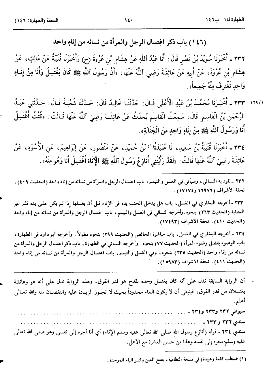 بَاب ذِكْرِ اغْتِسَالِ الرَّجُلِ وَالْمَرْأَةِ مِنْ نِسَائِهِ مِنْ إِنَاءٍ وَاحِدٍ 232 - أَخْبَرَنَا سُوَيْدُ بْنُ نَصْرٍ قَالَ أَنْبَأَنَا عَبْدُ اللَّهِ عَنْ هِشَامِ بْنِ عُرْوَةَ ح وَأَنْبَأَنَا قُتَيْبَةُ عَنْ مَالِكٍ عَنْ هِشَامِ بْنِ عُرْوَةَ عَنْ أَبِيهِ عَنْ عَائِشَةَ رَضِيَ اللَّهُ عَنْهَا أَنَّ رَسُولَ اللَّهِ صَلَّى اللَّهُ عَلَيْهِ وَسَلَّمَ كَانَ يَغْتَسِلُ وَأَنَا مِنْ إِنَاءٍ وَاحِدٍ نَغْتَرِفُ مِنْهُ جَمِيعًا