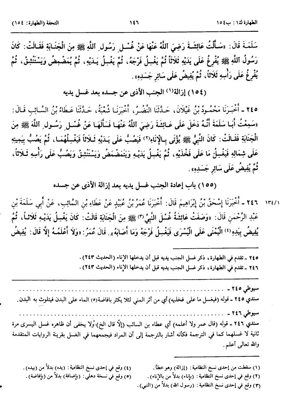 إِزَالَةُ الْجُنُبِ الْأَذَى عَنْ جَسَدِهِ بَعْدَ غَسْلِ يَدَيْهِ 245 - أَخْبَرَنَا مَحْمُودُ بْنُ غَيْلَانَ أَنْبَأَنَا النَّضْرُ قَالَ أَنْبَأَنَا شُعْبَةُ قَالَ أَنْبَأَنَا عَطَاءُ بْنُ السَّائِبِ قَالَ سَمِعْتُ أَبَا سَلَمَةَ أَنَّهُ دَخَلَ عَلَى عَائِشَةَ رَضِيَ اللَّهُ عَنْهَا فَسَأَلَهَا عَنْ غُسْلِ رَسُولِ اللَّهِ صَلَّى اللَّهُ عَلَيْهِ وَسَلَّمَ مِنْ الْجَنَابَةِ فَقَالَتْ كَانَ النَّبِيُّ صَلَّى اللَّهُ عَلَيْهِ وَسَلَّمَ يُؤْتَى بِالْإِنَاءِ فَيَصُبُّ عَلَى يَدَيْهِ ثَلَاثًا فَيَغْسِلُهُمَا ثُمَّ يَصُبُّ بِيَمِينِهِ عَلَى شِمَالِهِ فَيَغْسِلُ مَا عَلَى فَخِذَيْهِ ثُمَّ يَغْسِلُ يَدَيْهِ وَيَتَمَضْمَضُ وَيَسْتَنْشِقُ وَيَصُبُّ عَلَى رَأْسِهِ ثَلَاثًا ثُمَّ يُفِيضُ عَلَى سَائِرِ جَسَدِهِ