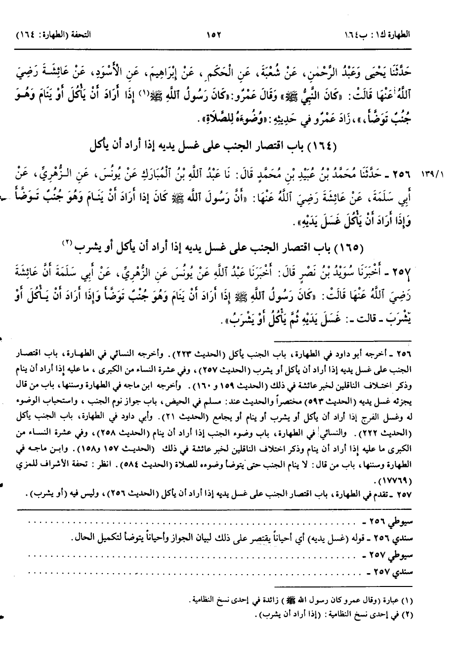 بَاب اقْتِصَارِ الْجُنُبِ عَلَى غَسْلِ يَدَيْهِ إِذَا أَرَادَ أَنْ يَأْكُلَ أَوْ يَشْرَبَ 257 - أَخْبَرَنَا سُوَيْدُ بْنُ نَصْرٍ قَالَ أَنْبَأَنَا عَبْدُ اللَّهِ عَنْ يُونُسَ عَنْ الزُّهْرِيِّ عَنْ أَبِي سَلَمَةَ أَنَّ عَائِشَةَ رَضِيَ اللَّهُ عَنْهَا قَالَتْ كَانَ رَسُولُ اللَّهِ صَلَّى اللَّهُ عَلَيْهِ وَسَلَّمَ إِذَا أَرَادَ أَنْ يَنَامَ وَهُوَ جُنُبٌ تَوَضَّأَ وَإِذَا أَرَادَ أَنْ يَأْكُلَ أَوْ يَشْرَبَ قَالَتْ غَسَلَ يَدَيْهِ ثُمَّ يَأْكُلُ أَوْ يَشْرَبُ