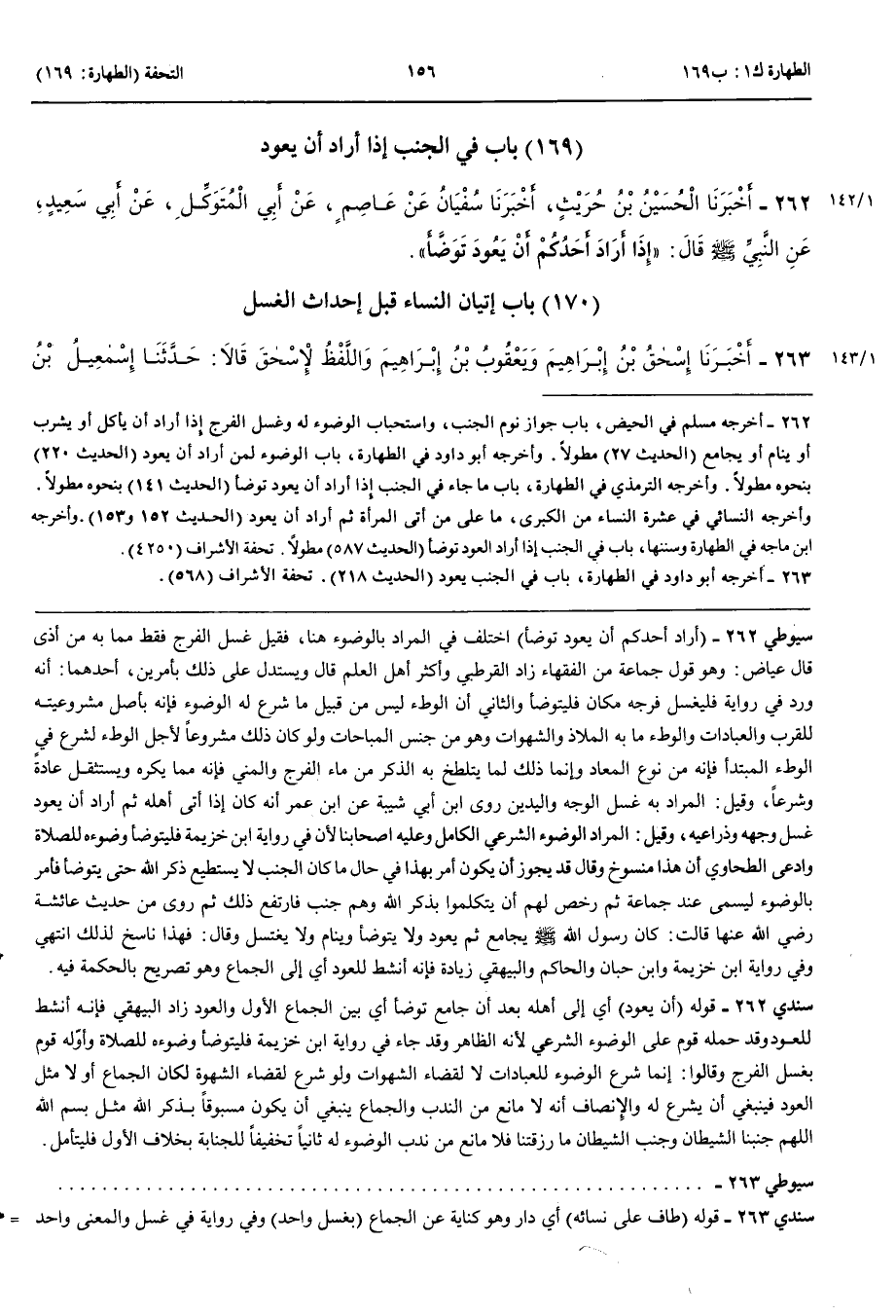 بَاب فِي الْجُنُبِ إِذَا أَرَادَ أَنْ يَعُودَ 262 - أَخْبَرَنَا الْحُسَيْنُ بْنُ حُرَيْثٍ قَالَ حَدَّثَنَا سُفْيَانُ عَنْ عَاصِمٍ عَنْ أَبِي الْمُتَوَكِّلِ عَنْ أَبِي سَعِيدٍ عَنْ النَّبِيِّ صَلَّى اللَّهُ عَلَيْهِ وَسَلَّمَ قَالَ إِذَا أَرَادَ أَحَدُكُمْ أَنْ يَعُودَ تَوَضَّأَ