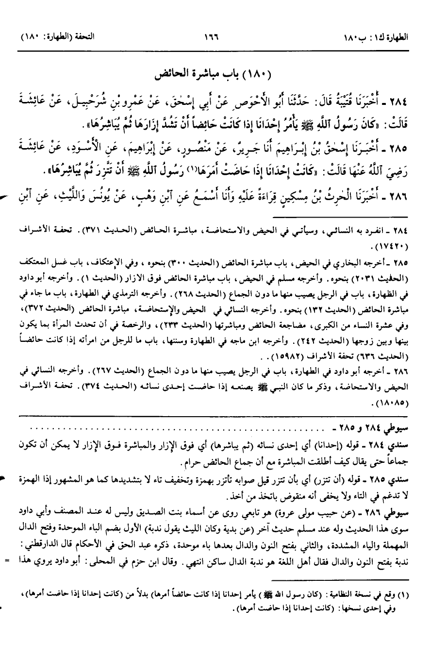 بَاب مُبَاشَرَةِ الْحَائِضِ 284 - أَخْبَرَنَا قُتَيْبَةُ قَالَ حَدَّثَنَا أَبُو الْأَحْوَصِ عَنْ أَبِي إِسْحَقَ عَنْ عَمْرِو بْنِ شُرَحْبِيلَ عَنْ عَائِشَةَ قَالَتْ كَانَ رَسُولُ اللَّهِ صَلَّى اللَّهُ عَلَيْهِ وَسَلَّمَ يَأْمُرُ إِحْدَانَا إِذَا كَانَتْ حَائِضًا أَنْ تَشُدَّ إِزَارَهَا ثُمَّ يُبَاشِرُهَا