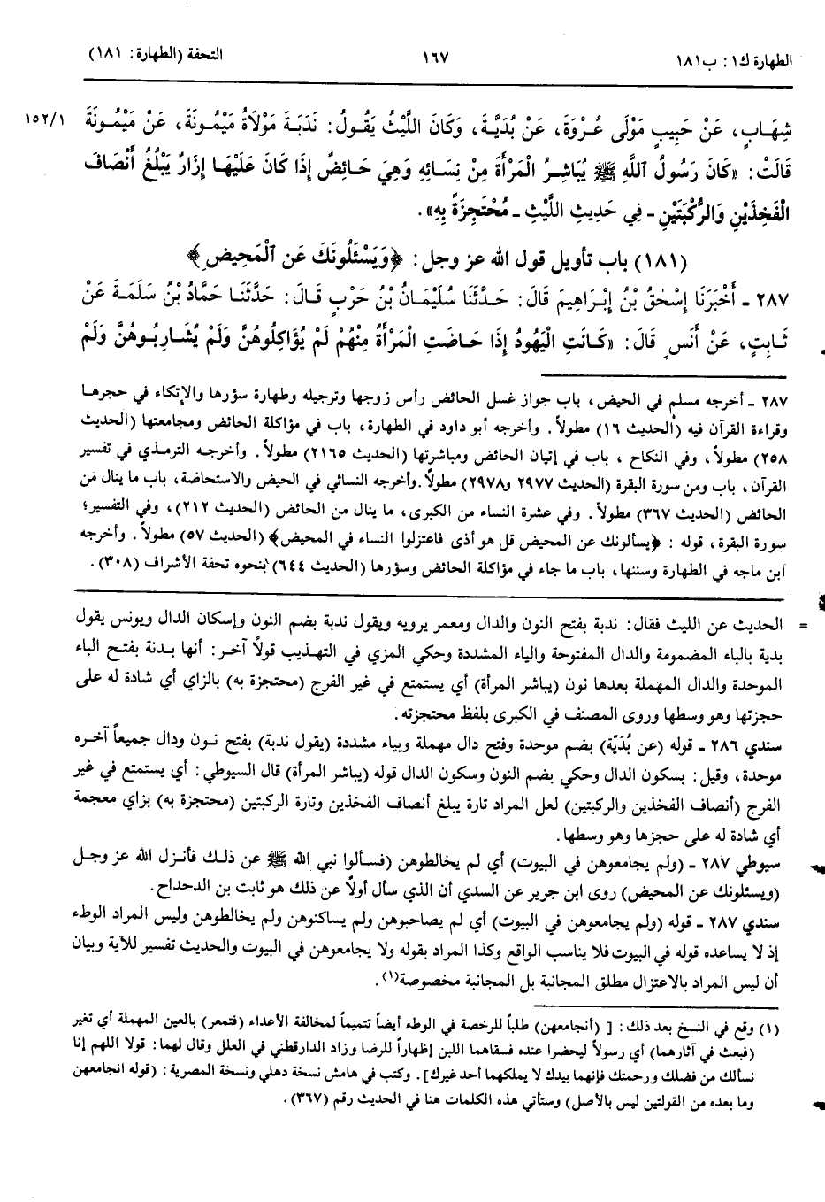 بَاب تَأْوِيلِ قَوْلِ اللَّهِ عَزَّ وَجَلَّ { وَيَسْأَلُونَكَ عَنْ الْمَحِيضِ } 287 - أَخْبَرَنَا إِسْحَقُ بْنُ إِبْرَاهِيمَ قَالَ حَدَّثَنَا سُلَيْمَانُ بْنُ حَرْبٍ قَالَ حَدَّثَنَا حَمَّادُ بْنُ سَلَمَةَ عَنْ ثَابِثٍ عَنْ أَنَسٍ قَالَ كَانَتْ الْيَهُودُ إِذَا حَاضَتْ الْمَرْأَةُ مِنْهُمْ لَمْ يُؤَاكِلُوهُنَّ وَلَمْ يُشَارِبُوهُنَّ وَلَمْ يُجَامِعُوهُنَّ فِي الْبُيُوتِ فَسَأَلُوا نَبِيَّ اللَّهِ صَلَّى اللَّهُ عَلَيْهِ وَسَلَّمَ عَنْ ذَلِكَ فَأَنْزَلَ اللَّهُ عَزَّ وَجَلَّ { وَيَسْأَلُونَكَ عَنْ الْمَحِيضِ قُلْ هُوَ أَذًى } الْآيَةَ فَأَمَرَهُمْ رَسُولُ اللَّهِ صَلَّى اللَّهُ عَلَيْهِ وَسَلَّمَ أَنْ يُؤَاكِلُوهُنَّ وَيُشَارِبُوهُنَّ وَيُجَامِعُوهُنَّ فِي الْبُيُوتِ وَأَنْ يَصْنَعُوا بِهِنَّ كُلَّ شَيْءٍ مَا خَلَا الْجِمَاعَ