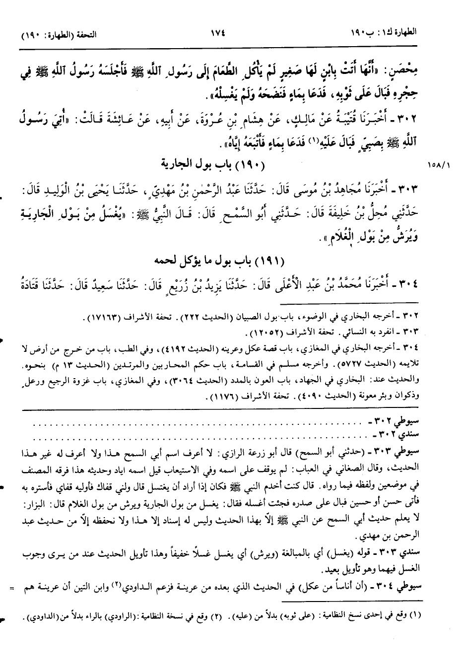 بَاب بَوْلِ الْجَارِيَةِ 303 - أَخْبَرَنَا مُجَاهِدُ بْنُ مُوسَى قَالَ حَدَّثَنَا عَبْدُ الرَّحْمَنِ بْنُ مَهْدِيٍّ قَالَ حَدَّثَنَا يَحْيَى بْنُ الْوَلِيدِ قَالَ حَدَّثَنِي مُحِلُّ بْنُ خَلِيفَةَ قَالَ حَدَّثَنِي أَبُو السَّمْحِ قَالَ قَالَ النَّبِيُّ صَلَّى اللَّهُ عَلَيْهِ وَسَلَّمَ يُغْسَلُ مِنْ بَوْلِ الْجَارِيَةِ وَيُرَشُّ مِنْ بَوْلِ الْغُلَامِ