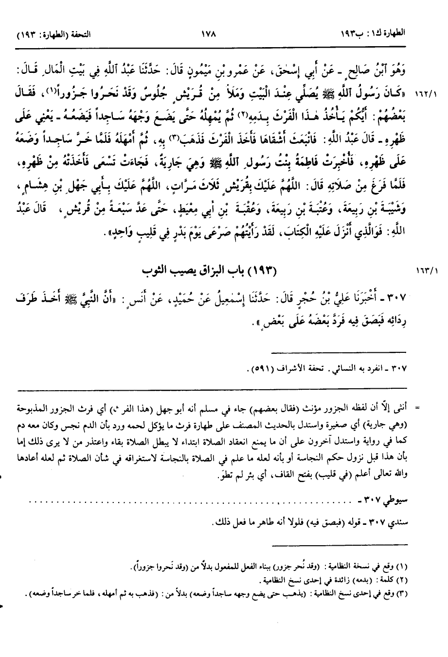 بَاب الْبُزَاقِ يُصِيبُ الثَّوْبَ 307 - أَخْبَرَنَا عَلِيُّ بْنُ حُجْرٍ قَالَ حَدَّثَنَا إِسْمَعِيلُ عَنْ حُمَيْدٍ عَنْ أَنَسٍ أَنَّ النَّبِيَّ صَلَّى اللَّهُ عَلَيْهِ وَسَلَّمَ أَخَذَ طَرَفَ رِدَائِهِ فَبَصَقَ فِيهِ فَرَدَّ بَعْضَهُ عَلَى بَعْضٍ