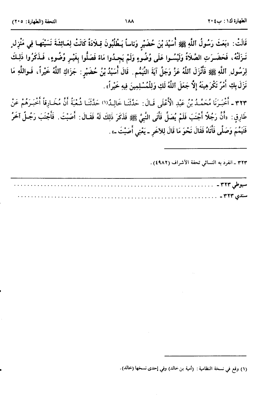 323 - أَخْبَرَنَا مُحَمَّدُ بْنُ عَبْدِ الْأَعْلَى قَالَ حَدَّثَنَا خَالِدٌ قَالَ أَنْبَأَنَا شُعْبَةُ أَنَّ مُخَارِقًا أَخْبَرَهُمْ عَنْ طَارِقٍ أَنْ رَجُلًا أَجْنَبَ فَلَمْ يُصَلِّ فَأَتَى النَّبِيَّ صَلَّى اللَّهُ عَلَيْهِ وَسَلَّمَ فَذَكَرَ ذَلِكَ لَهُ فَقَالَ أَصَبْتَ فَأَجْنَبَ رَجُلٌ آخَرَ فَتَيَمَّمَ وَصَلَّى فَأَتَاهُ فَقَالَ نَحْوَ مَا قَالَ لِلْآخَرِ يَعْنِي أَصَبْتَ