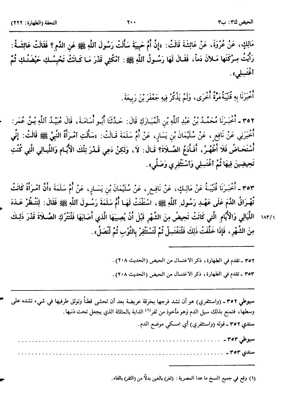 353 - أَخْبَرَنَا قُتَيْبَةُ عَنْ مَالِكٍ عَنْ نَافِعٍ عَنْ سُلَيْمَانَ بْنِ يَسَارٍ عَنْ أُمِّ سَلَمَةَ أَنَّ امْرَأَةً كَانَتْ تُهَرَاقُ الدَّمَ عَلَى عَهْدِ رَسُولِ اللَّهِ صَلَّى اللَّهُ عَلَيْهِ وَسَلَّمَ اسْتَفْتَتْ لَهَا أُمُّ سَلَمَةَ رَسُولَ اللَّهِ صَلَّى اللَّهُ عَلَيْهِ وَسَلَّمَ فَقَالَ لِتَنْظُرْ عَدَدَ اللَّيَالِي وَالْأَيَّامِ الَّتِي كَانَتْ تَحِيضُ مِنْ الشَّهْرِ قَبْلَ أَنْ يُصِيبَهَا الَّذِي أَصَابَهَا فَلْتَتْرُكْ الصَّلَاةَ قَدْرَ ذَلِكَ مِنْ الشَّهْرِ فَإِذَا خَلَّفَتْ ذَلِكَ فَلْتَغْتَسِلْ ثُمَّ لِتَسْتَثْفِرْ بِالثَّوْبِ ثُمَّ لِتُصَلِّ
