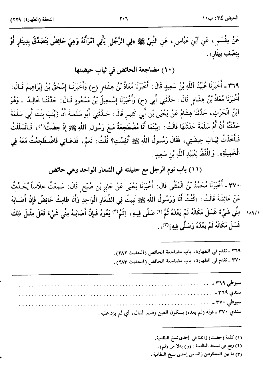 بَاب نَوْمِ الرَّجُلِ مَعَ حَلِيلَتِهِ فِي الشِّعَارِ الْوَاحِدِ وَهِيَ حَائِضٌ 370 - أَخْبَرَنَا مُحَمَّدُ بْنُ الْمُثَنَّى قَالَ حَدَّثَنَا يَحْيَى عَنْ جَابِرِ بْنِ صُبْحٍ قَالَ سَمِعْتُ خِلَاسًا يُحَدِّثُ عَنْ عَائِشَةَ قَالَتْ كُنْتُ أَنَا وَرَسُولُ اللَّهِ صَلَّى اللَّهُ عَلَيْهِ وَسَلَّمَ نَبِيتُ فِي الشِّعَارِ الْوَاحِدِ وَأَنَا طَامِثٌ حَائِضٌ فَإِنْ أَصَابَهُ مِنِّي شَيْءٌ غَسَلَ مَكَانَهُ لَمْ يَعْدُهُ ثُمَّ صَلَّى فِيهِ ثُمَّ يَعُودُ فَإِنْ أَصَابَهُ مِنِّي شَيْءٌ فَعَلَ مِثْلَ ذَلِكَ غَسَلَ مَكَانَهُ لَمْ يَعْدُهُ وَصَلَّى فِيهِ