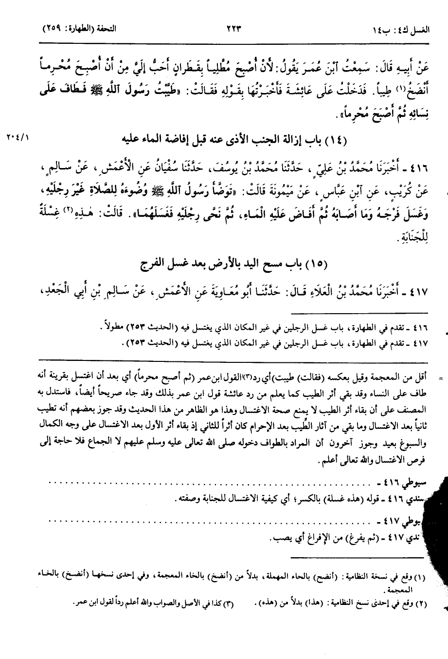 بَاب مَسْحِ الْيَدِ بِالْأَرْضِ بَعْدَ غَسْلِ الْفَرْجِ 417 - أَخْبَرَنَا مُحَمَّدُ بْنُ الْعَلَاءِ قَالَ حَدَّثَنَا أَبُو مُعَاوِيَةَ عَنْ الْأَعْمَشِ عَنْ سَالِمِ بْنِ أَبِي الْجَعْدِ عَنْ كُرَيْبٍ عَنْ ابْنِ عَبَّاسٍ عَنْ مَيْمُونَةَ بِنْتِ الْحَارِثِ زَوْجِ النَّبِيِّ صَلَّى اللَّهُ عَلَيْهِ وَسَلَّمَ قَالَتْ كَانَ رَسُولُ اللَّهِ صَلَّى اللَّهُ عَلَيْهِ وَسَلَّمَ إِذَا اغْتَسَلَ مِنْ الْجَنَابَةِ يَبْدَأُ فَيَغْسِلُ يَدَيْهِ ثُمَّ يُفْرِغُ بِيَمِينِهِ عَلَى شِمَالِهِ فَيَغْسِلُ فَرْجَهُ ثُمَّ يَضْرِبُ بِيَدِهِ عَلَى الْأَرْضِ ثُمَّ يَمْسَحُهَا ثُمَّ يَغْسِلُهَا ثُمَّ يَتَوَضَّأُ وُضُوءَهُ لِلصَّلَاةِ ثُمَّ يُفْرِغُ عَلَى رَأْسِهِ وَعَلَى سَائِرِ جَسَدِهِ ثُمَّ يَتَنَحَّى فَيَغْسِلُ رِجْلَيْهِ