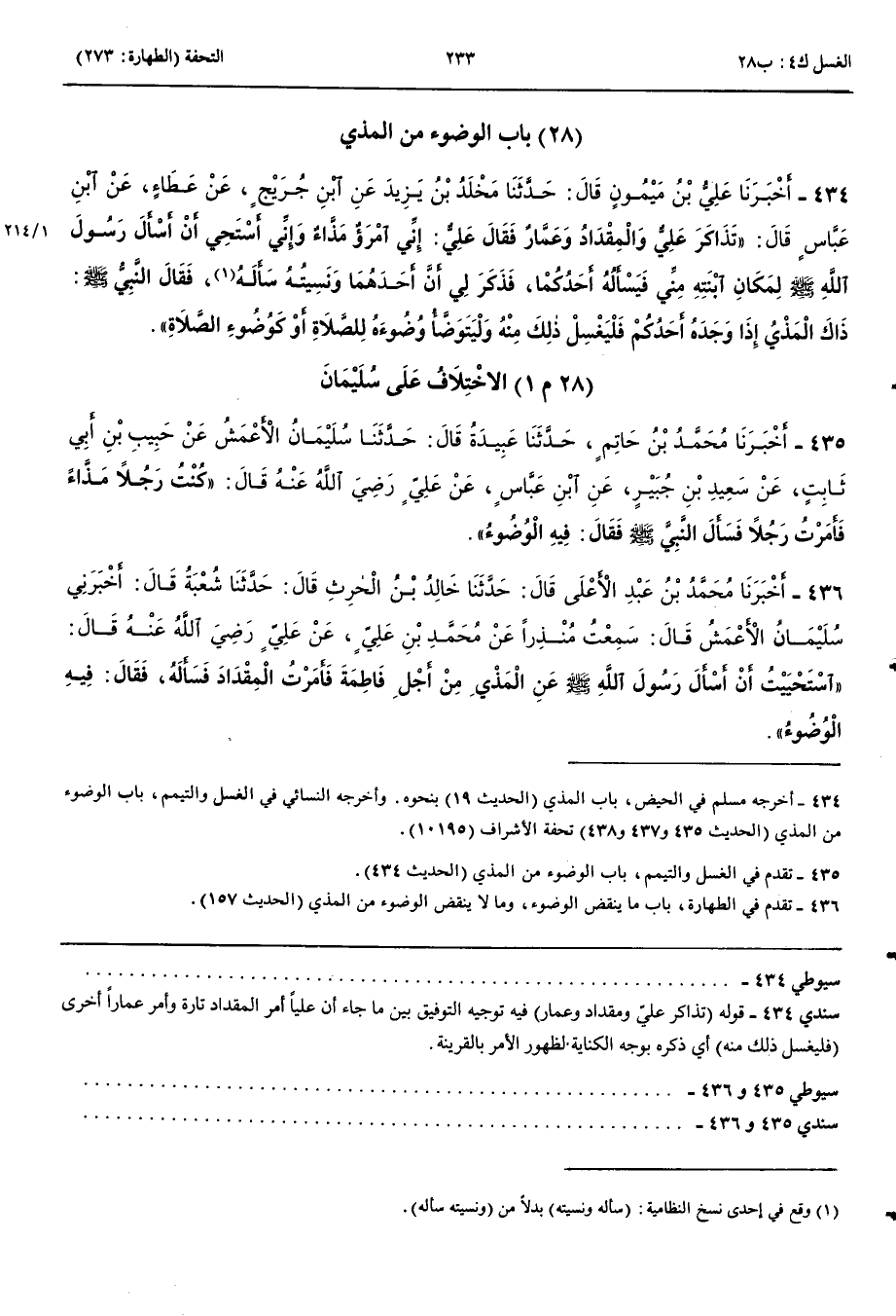 435 - أَخْبَرَنَا مُحَمَّدُ بْنُ حَاتِمٍ قَالَ حَدَّثَنَا عَبِيدَةُ قَالَ حَدَّثَنَا سُلَيْمَانُ الْأَعْمَشُ عَنْ حَبِيبِ بْنِ أَبِي ثَابِتٍ عَنْ سَعِيدِ بْنِ جُبَيْرٍ عَنْ ابْنِ عَبَّاسٍ عَنْ عَلِيٍّ رَضِيَ اللَّهُ عَنْهُ قَالَ كُنْتُ رَجُلًا مَذَّاءً فَأَمَرْتُ رَجُلًا فَسَأَلَ النَّبِيَّ صَلَّى اللَّهُ عَلَيْهِ وَسَلَّمَ فَقَالَ فِيهِ الْوُضُوءُ